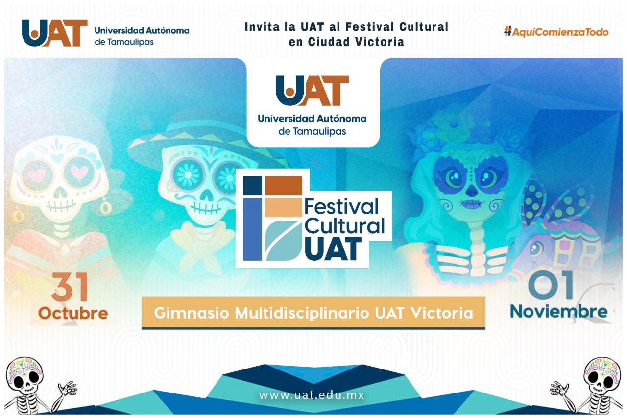 La Universidad Autónoma de Tamaulipas invita a la comunidad universitaria y sociedad en general al Festival Cultural UAT, en el cual se ha programado una diversidad de eventos a realizarse el lunes 31 de octubre y el martes 1 de noviembre, en las instalaciones del Gimnasio Multidisciplinario Victoria.