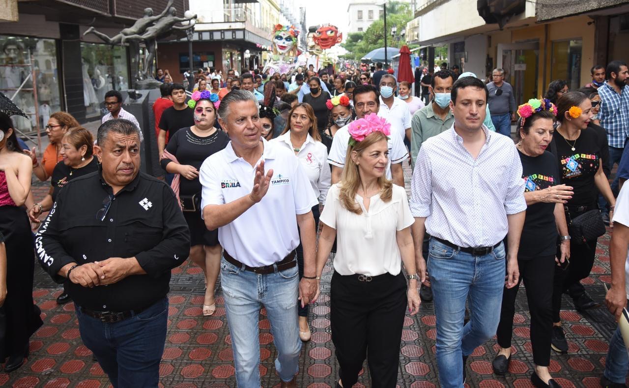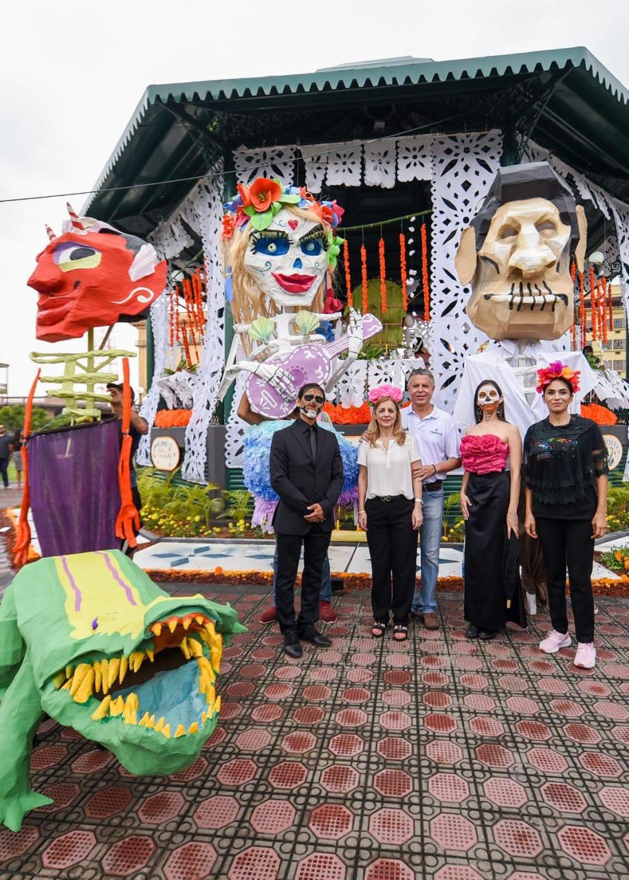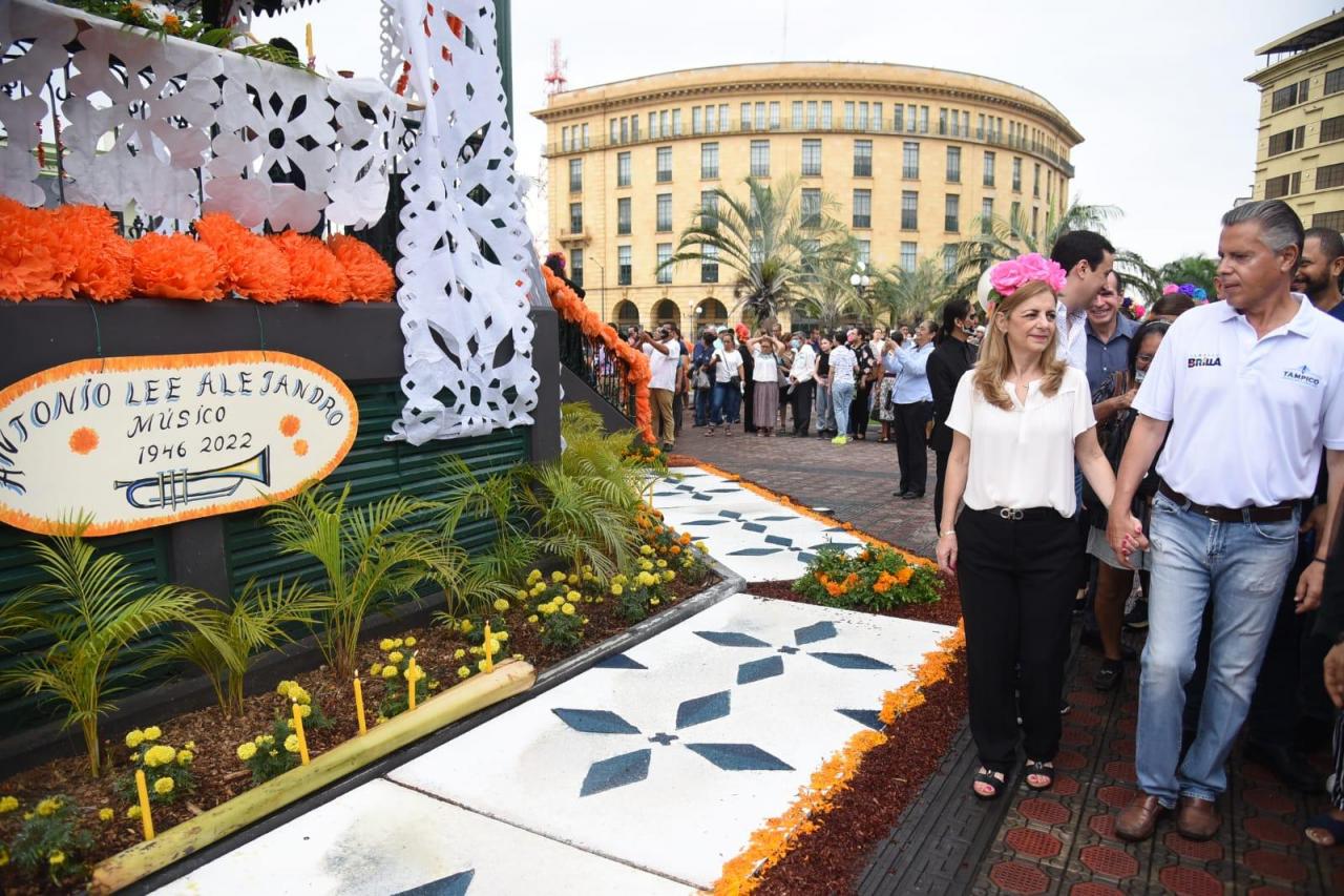 El Presidente municipal Chucho Nader y su esposa Aída Féres de Nader, titular del Sistema DIF Tampico encabezaron la instalación del monumental Altar de Día de Muertos en el kiosco de la Plaza de la Libertad en el marco de los festejos que lleva a cabo el Ayuntamiento porteño para conmemorar esta tradición popular.
