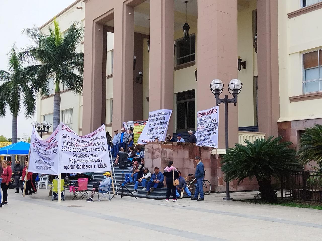 En rechazo a condiciones generales de trabajo que pretende imponer el alcalde de Victoria, Eduardo Gattás Báez, trabajadores del Ayuntamiento iniciaron un plantón frente al Palacio de Gobierno.