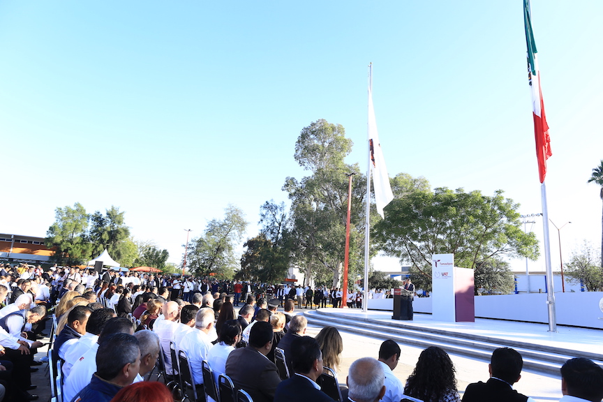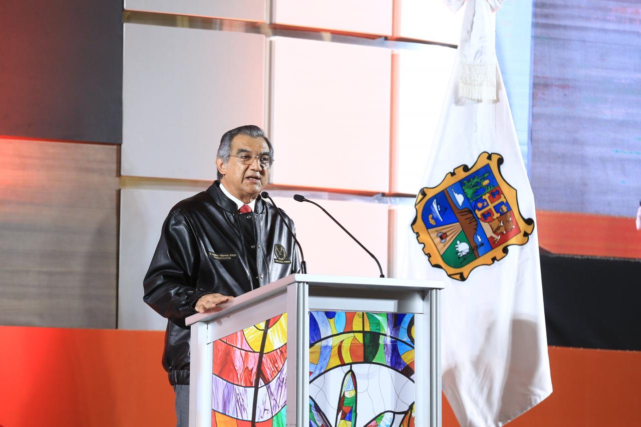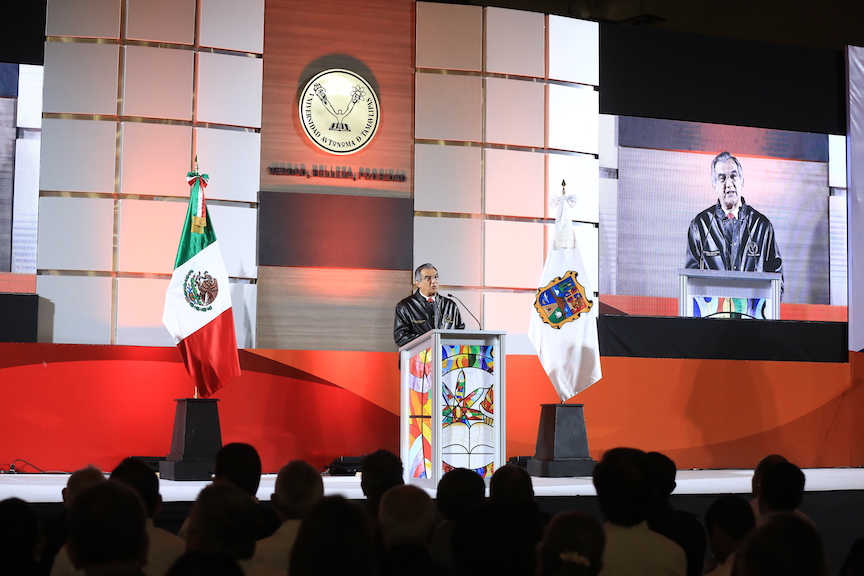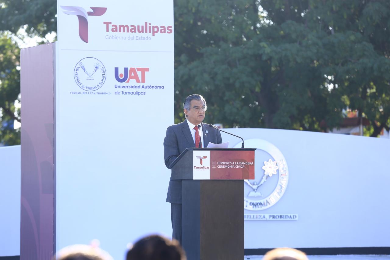 En su mensaje, Américo Villarreal expresó que el espacio universitario, además de proveer a los jóvenes estudiantes, de la técnica y el conocimiento en la profesión o disciplina específica en la que se preparan, debe forjar personas con conciencia de su cultura, de su identidad, de su condición de seres humanos y de la responsabilidad moral, que cada uno tiene ante los demás y ante la sociedad.