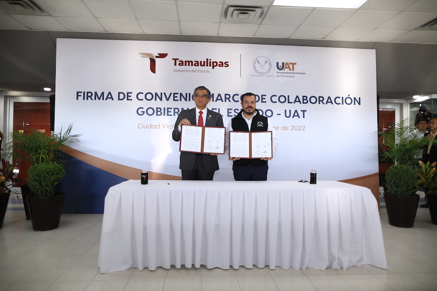 En el marco de la celebración del 72 aniversario de la fundación de la Universidad Autónoma de Tamaulipas y de la ceremonia cívica de honores que se realizó este lunes, en la nueva plazoleta cívica de la UAT Campus Victoria, el gobernador del Estado firmó el convenio marco que establece las nuevas bases de colaboración entre el Gobierno del Estado y la Universidad.