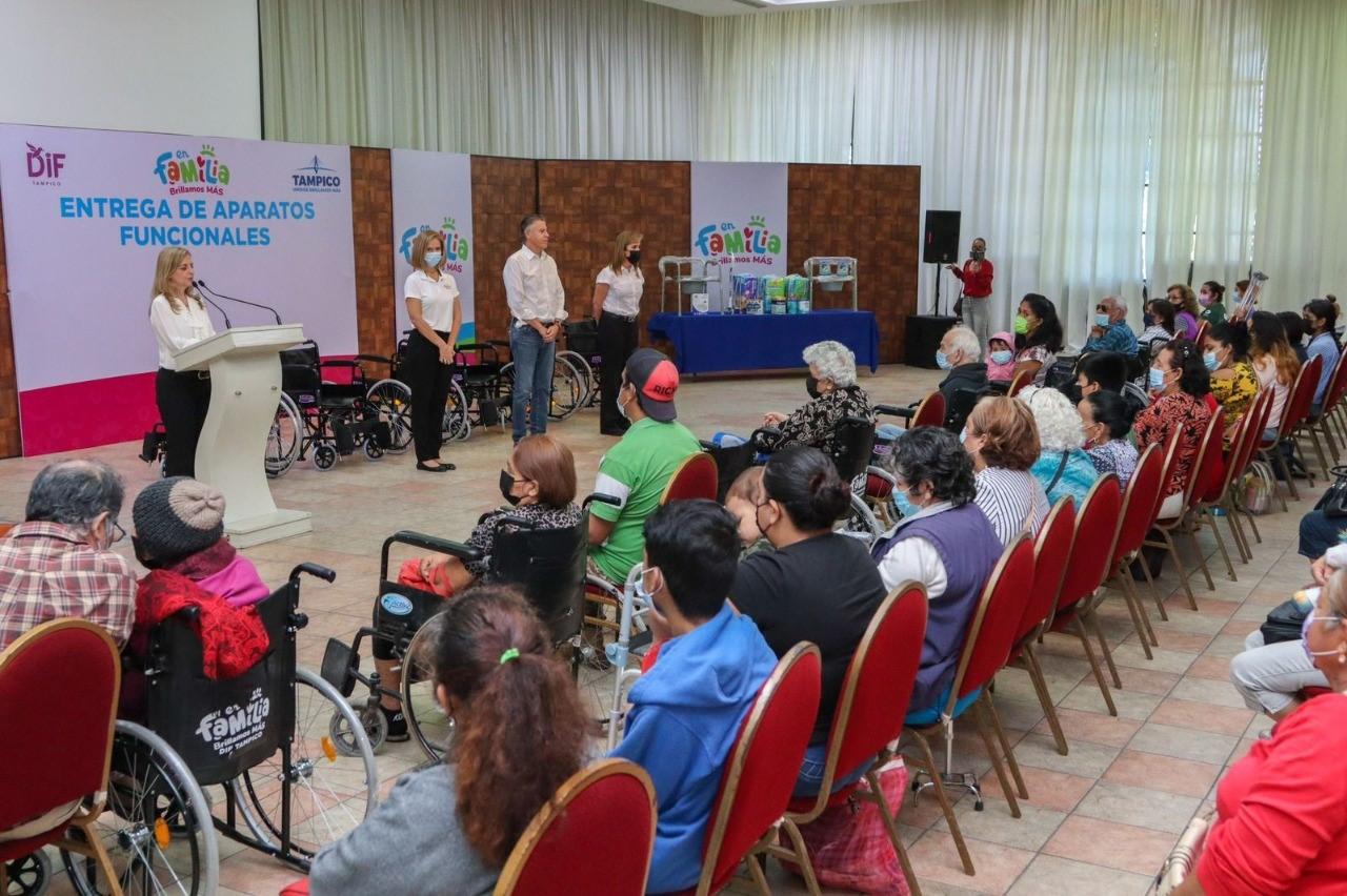 Con el objetivo de mejorar la calidad de vida y facilitar el desplazamiento y traslado de las personas con discapacidad, la titular del Sistema DIF Tampico, Aída Féres de Nader encabezó este lunes, una nueva entrega de apoyos funcionales en la Casa de la Cultura.