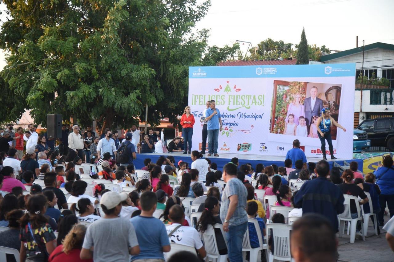Cientos de niños tampiqueños y sus familias disfrutaron un extraordinario festival navideño en el espacio deportivo de la colonia Luis Echeverría del sector Infonavit, al dar inicio los festejos decembrinos por parte del Gobierno de Tampico.