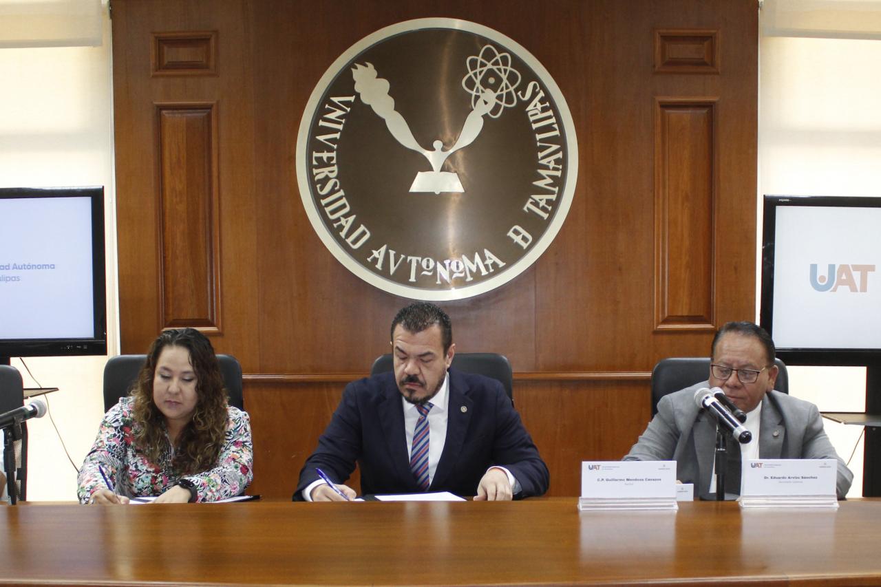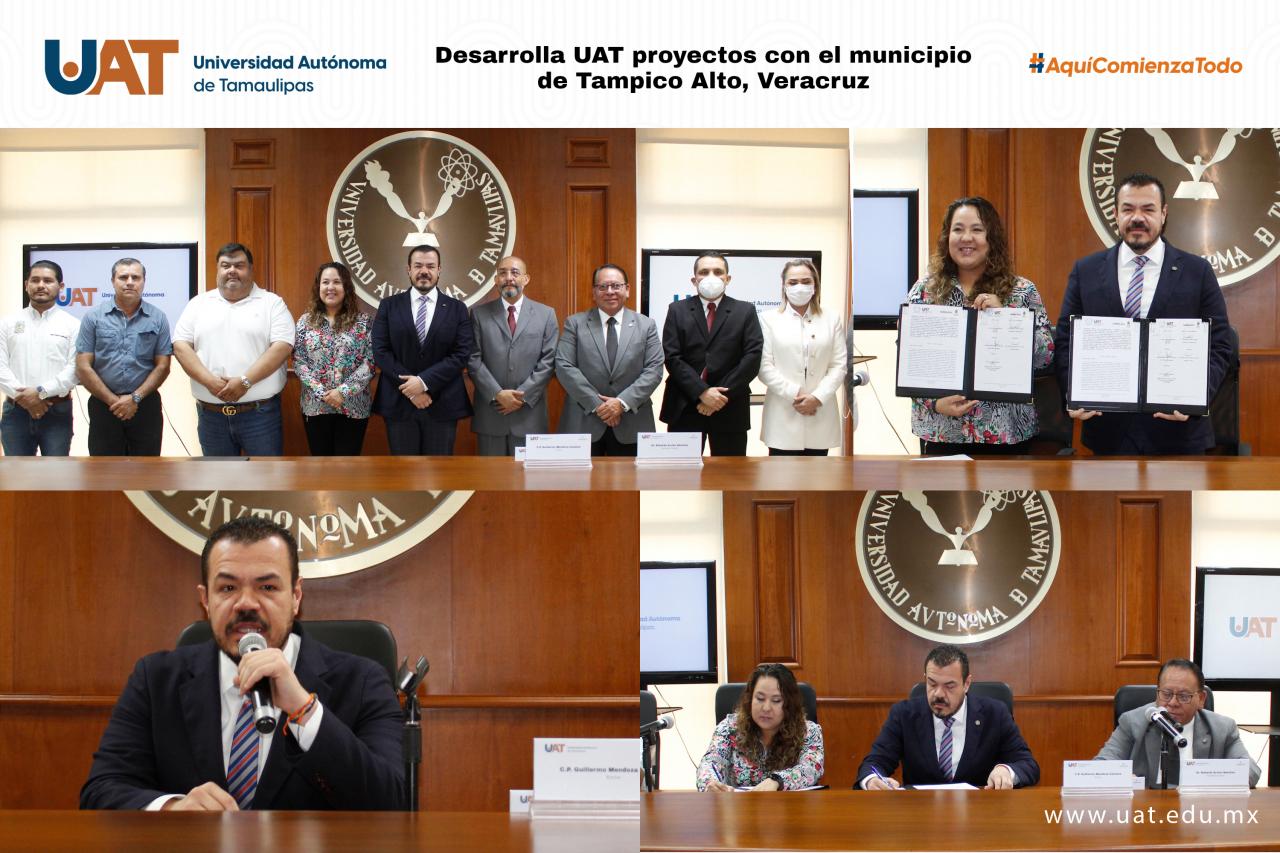 La Universidad Autónoma de Tamaulipas (UAT) firmó un convenio marco de colaboración en materia académica, científica y tecnológica con el Ayuntamiento de Tampico Alto, Veracruz, con la finalidad de reforzar los proyectos que realizan investigadores, docentes y estudiantes universitarios en las comunidades de este municipio.