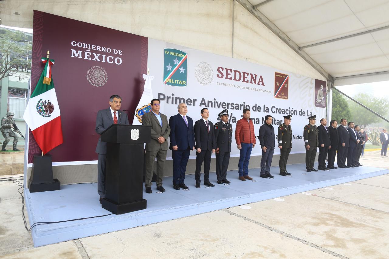 Al asistir este lunes a la ceremonia cívica de honores a la bandera, en la explanada del Campo Militar del 77 Batallón de Infantería, donde se conmemoró el primer aniversario de la 48/a Zona Militar, señaló que desde el pasado 1 de octubre, las Fuerzas Armadas han asumido una participación activa y de apoyo al desarrollo general de Tamaulipas, y en particular su respaldo a la nueva estrategia de seguridad, ha sido muy valioso.