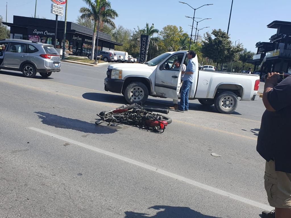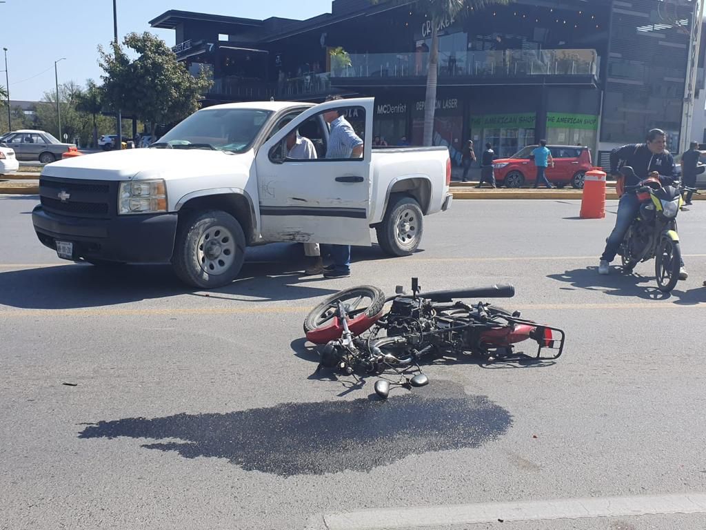 Después de pasar la calle Baja California y antes de llegar al Bulevar Adolfo López Mateos frente a la Plaza Comercial Los Arcos, al paso del motociclista se atravesó una camioneta de la marca Chevrolet tipo pickup con placas de Tamaulipas.