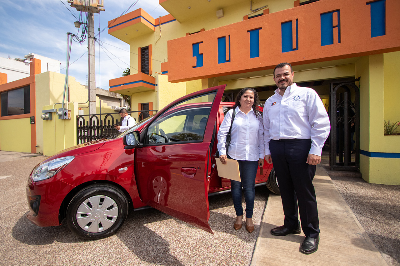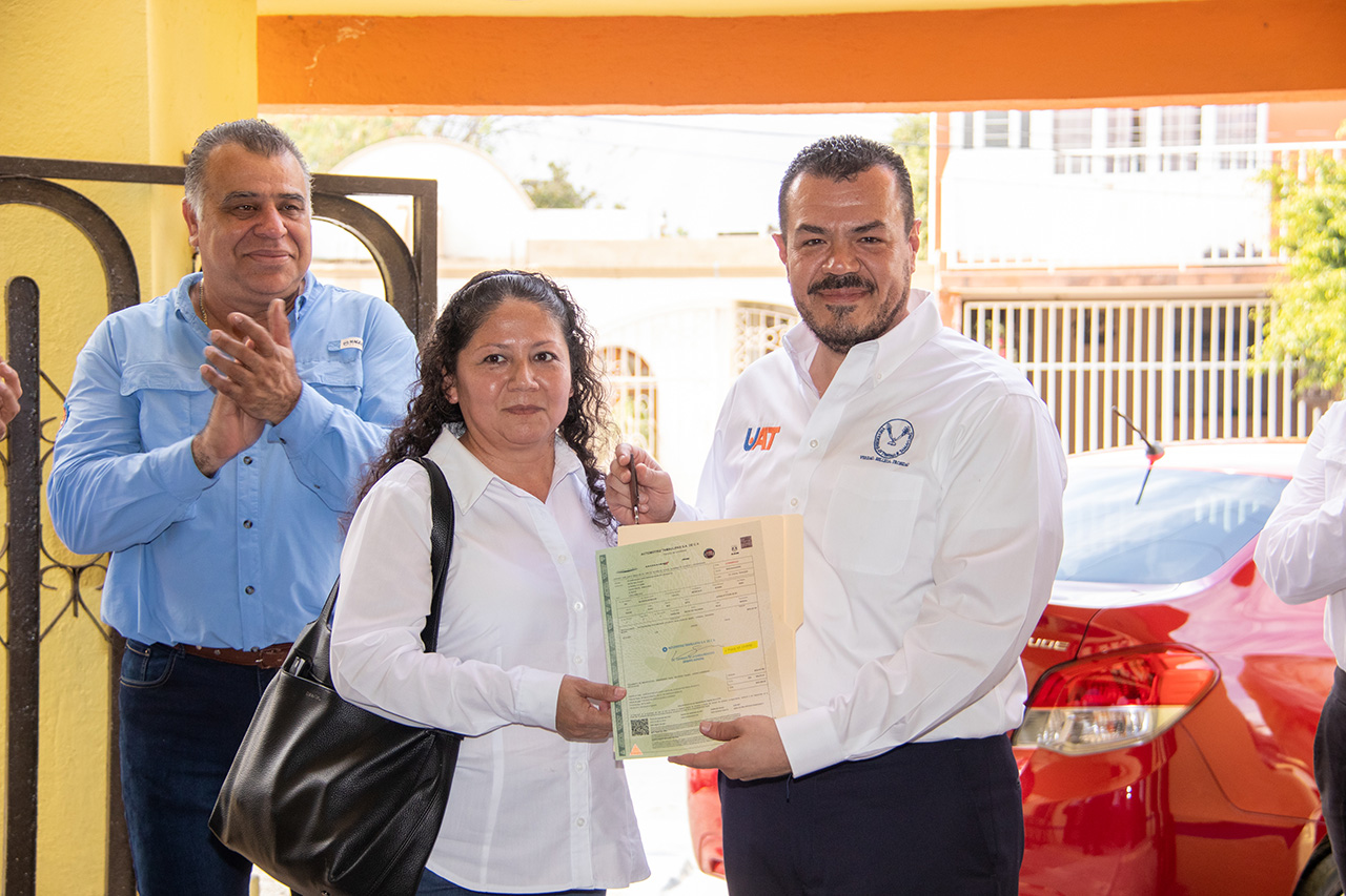 En cumplimiento de los compromisos establecidos en el contrato colectivo laboral, el C. P. Guillermo Mendoza Cavazos, rector de la Universidad Autónoma de Tamaulipas (UAT), entregó el vehículo sorteado entre el personal perteneciente al Sindicato Único de Trabajadores (SUTUAT).