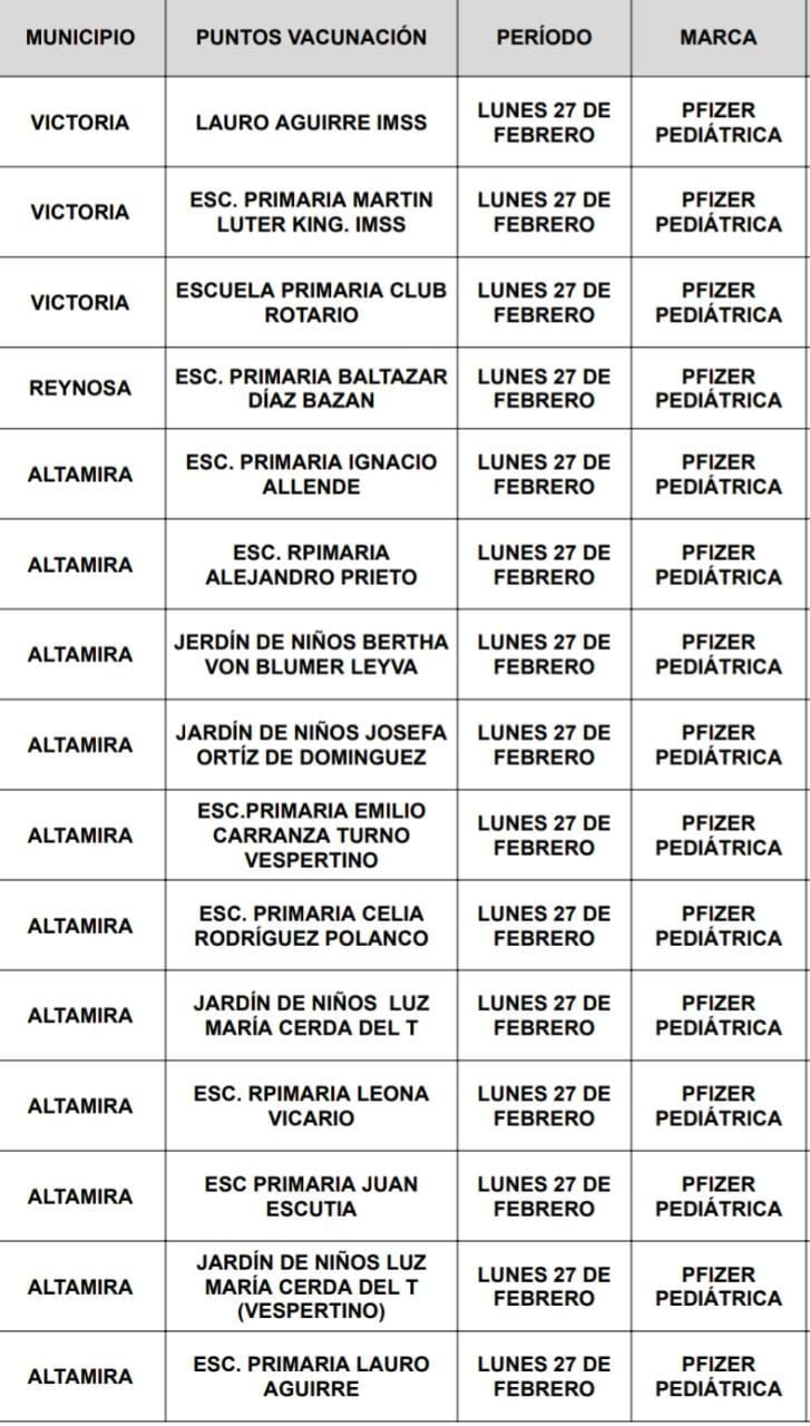 Para Reynosa en la escuela primaria Baltazar Díaz Bazán, en Altamira en la escuela primaria Ignacio Allende, escuela primaria Alejandro Prieto, jardín de niños Bertha Von Blumer Leyva, jardín de niños Josefa Ortiz de Domínguez, escuela primaria Emilio Carranza y la Corregidora.