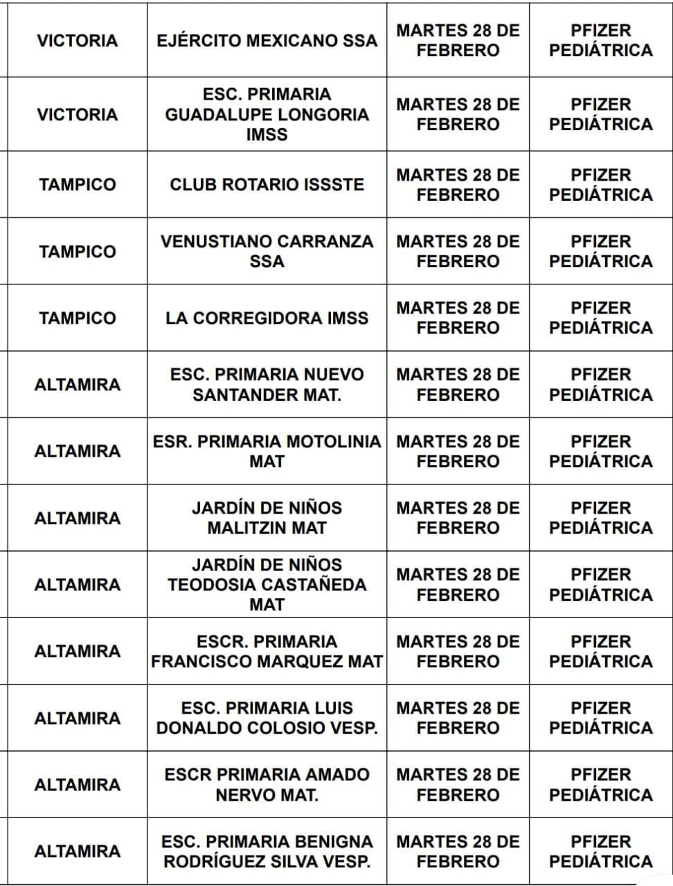 Para el martes 28 de febrero se programó en la escuela Ejército Mexicano y primaria Guadalupe Longoria, en Tampico en la escuela Club Rotario, Venustiano Carranza y la Corregidora.