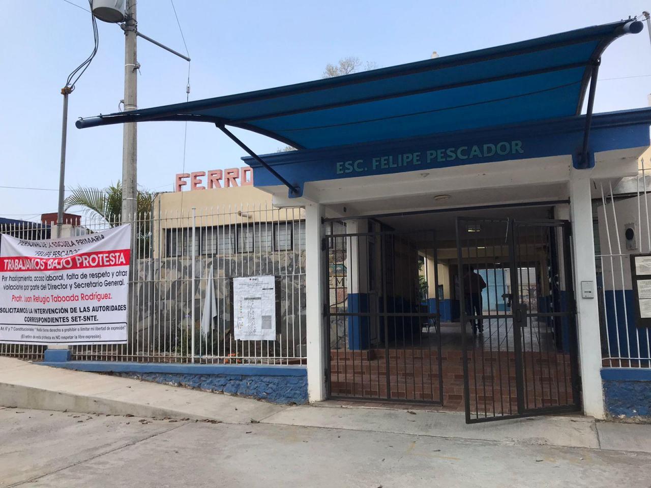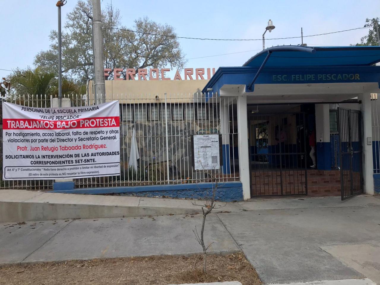 “Personal de la Escuela Primaria Felipe Pescador Trabajamos Bajo Protesta por hostigamiento, acoso laboral, falta de respeto y otras violaciones por parte del Director y Secretario General Profr. Juan Refugio Taboada Rodríguez”.