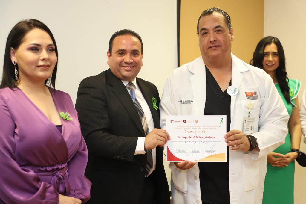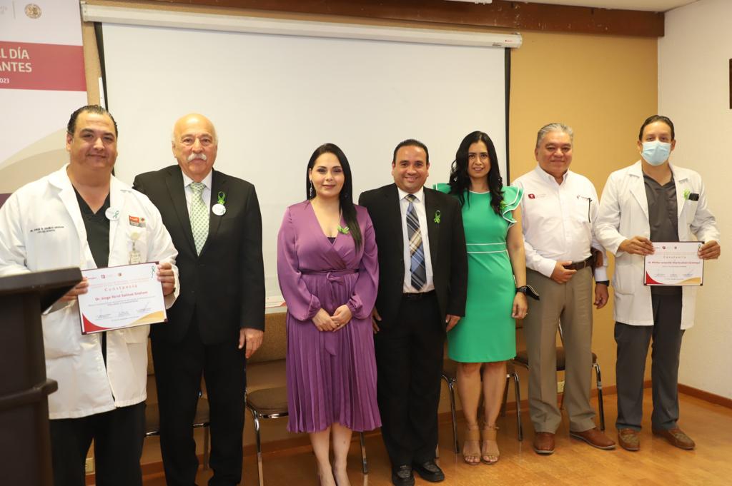 Representando al equipo multidisciplinario de Procuración Orgánica, se entregaron reconocimientos al doctor Jorge René Salinas Graham, médico trasplantólogo de la institución y al doctor Héctor Leopoldo Díaz Guzmán Verastegui, médico trasplantólogo de córnea; así como al médico interno de pregrado, José Antonio González Cabriales, por su colaboración en la realización de electroencefalogramas en el proceso de procuración de órganos.