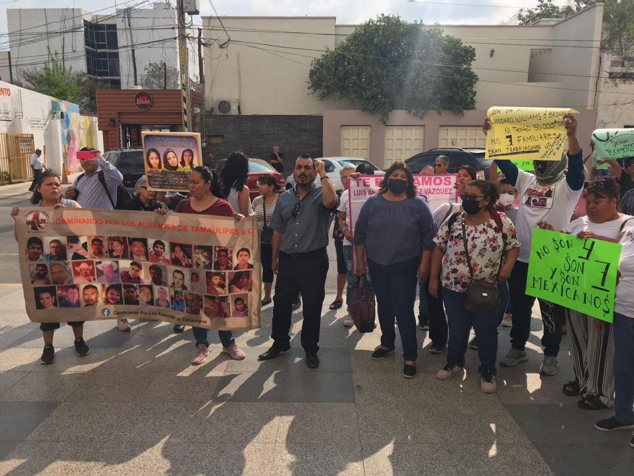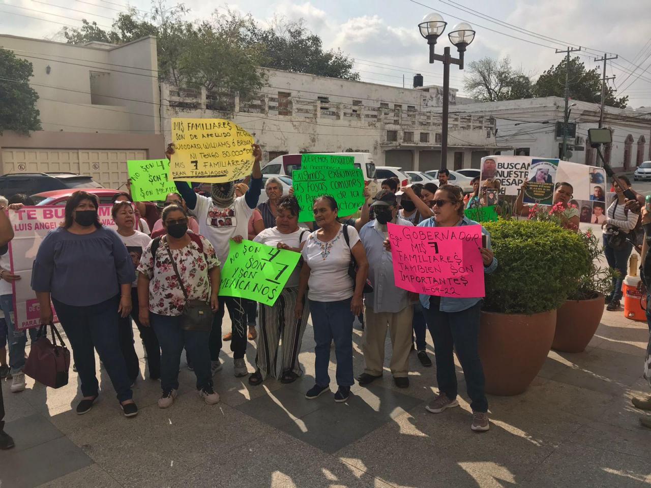 Con cartulinas con mensajes como “Buscamos nuestros desaparecidos”, “Mis siete familiares también son importantes”, “Mis familiares no son de apellido McGee, Woodard, Williams o Brown”, los manifestantes gritaron diversas consignas antes de ingresar a Palacio de Gobierno.
