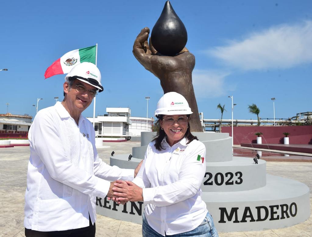 El presidente López Obrador estuvo acompañado de la secretaria de Energía, Rocío Nahle García y del director de Pemex, Octavio Romero Oropeza, para efectuar una reunión de evaluación de los trabajos que llevarán a este centro refinador, a producir a fin de año, 160 mil barriles diarios de petróleo.