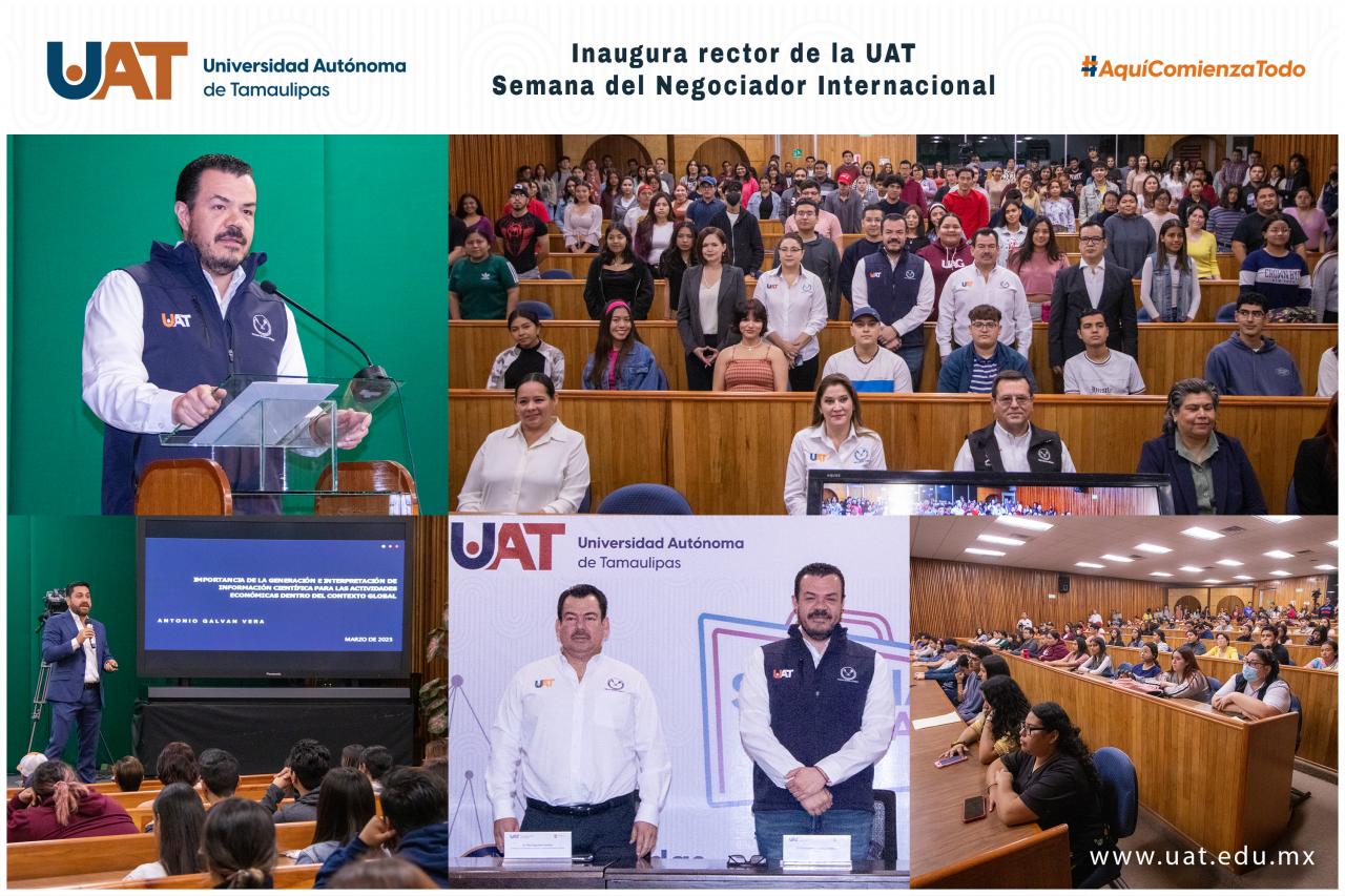 El C. P. Guillermo Mendoza Cavazos, rector de la Universidad Autónoma de Tamaulipas (UAT), inauguró la Semana del Negociador Internacional, organizada por la Facultad de Derecho y Ciencias Sociales Victoria (FDCSV), evento en el que participan especialistas nacionales y extranjeros.