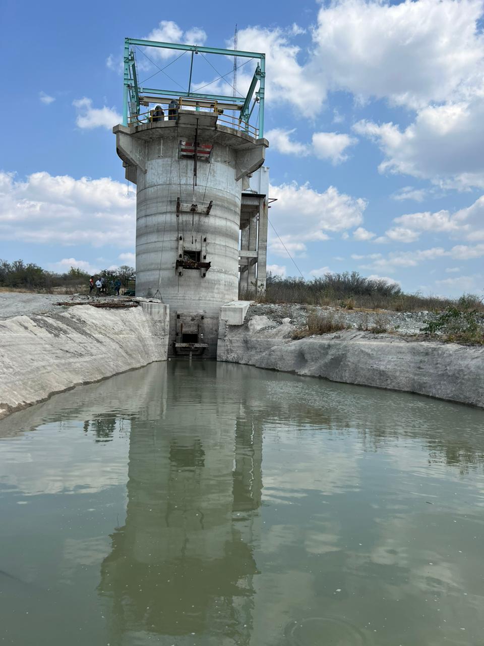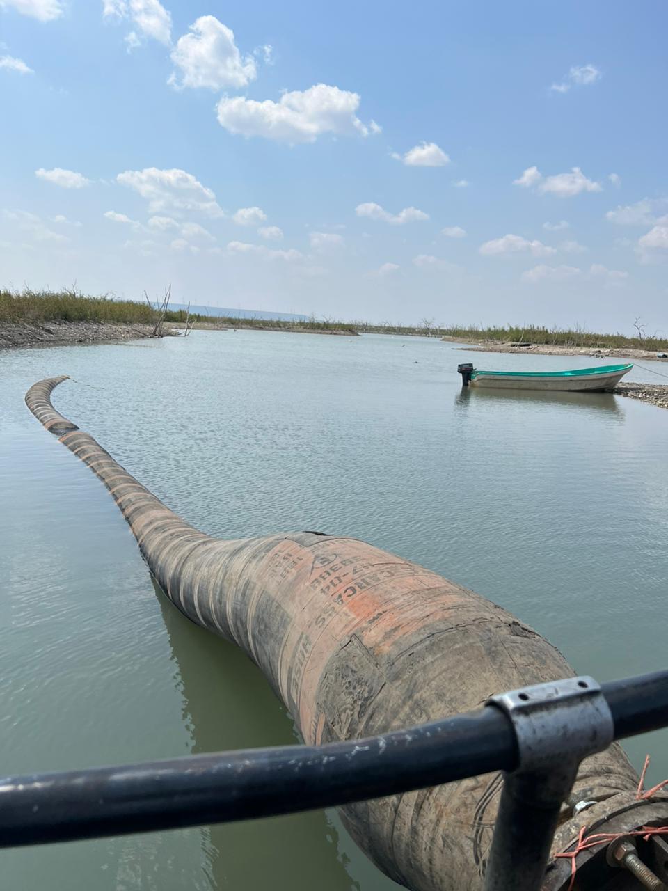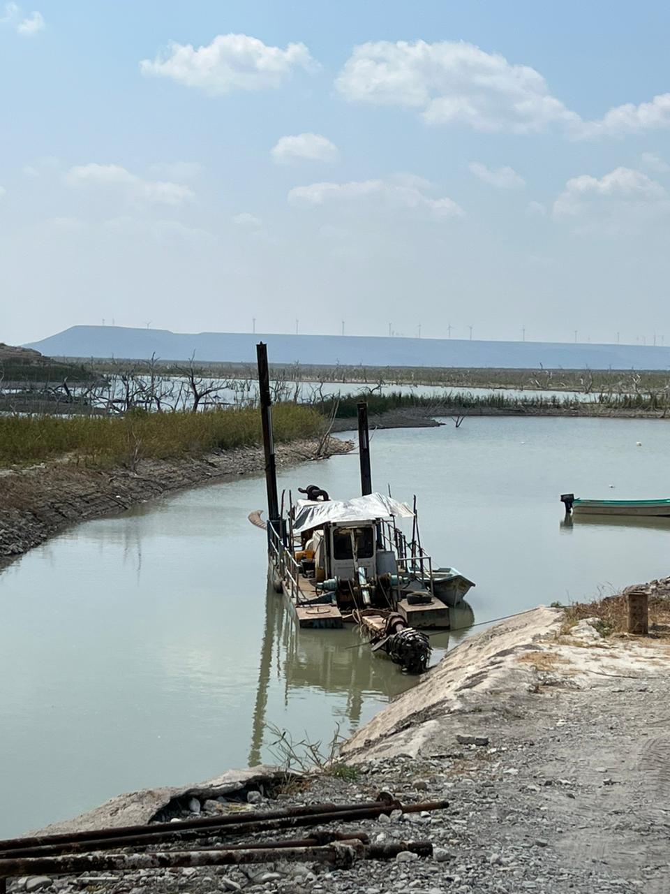 En el canal de llamada, se realizan trabajos de desazolve del kilómetro 0+012 al 0+480, con una extracción de material de 6,100.00 m3, lo que representa el 50% del tramo para llegar a la elevación de plantilla de proyecto del canal.