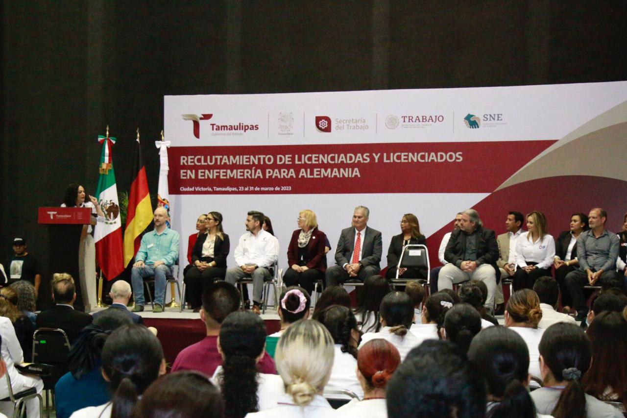 Asimismo, agradeció al Dr. Thomas Gemperlein de la Agencia Federal del Empleo Alemana, por su interés de reclutar a profesionales de la enfermería en Tamaulipas, siendo un total de 84 aspirantes registrados con sus expedientes en regla, para competir por una de las 50 vacantes disponibles.