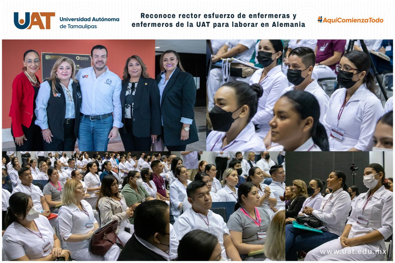 El C. P. Guillermo Mendoza Cavazos, rector de la Universidad Autónoma de Tamaulipas (UAT), reconoció el esfuerzo de egresados de la Licenciatura de Enfermería de esta casa de estudios, quienes, luego de concluir su formación en la UAT, participan para trabajar en Alemania.