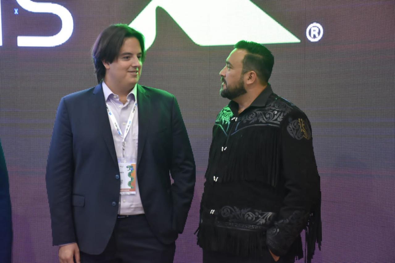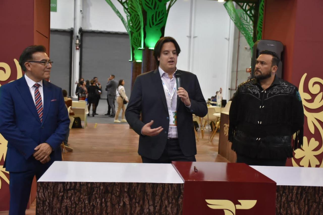 Javier Herrera, director general, Miguel Legorreta, director comercial y Daniela Ramírez DGte Marketing de Aerus, realizaron el anuncio al secretario de Turismo Benjamín Hernández Rodríguez en el stand de Tamaulipas.