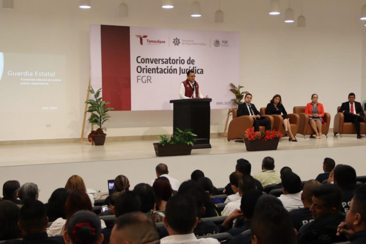 Ciudad Victoria, Tamaulipas. - Personal de la Secretaría de Seguridad Pública de Tamaulipas (SSPT) asistió al conversatorio “Atención de llamadas y detenciones en flagrancia”, impartido por Marco Antonio Pérez Tovar, encargado de la subsede de la Fiscalía General de la República (FGR) en Ciudad Victoria y fiscal en jefe del equipo de investigación y litigación seis.