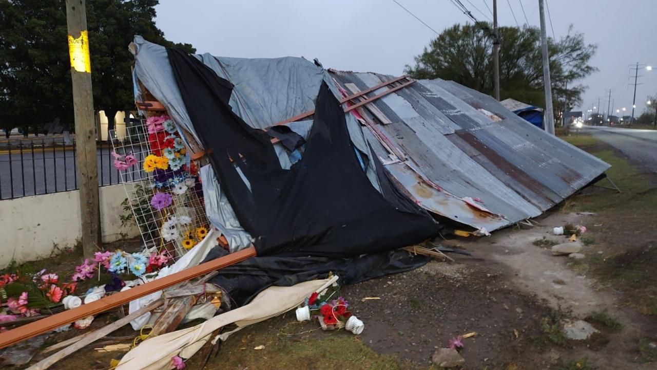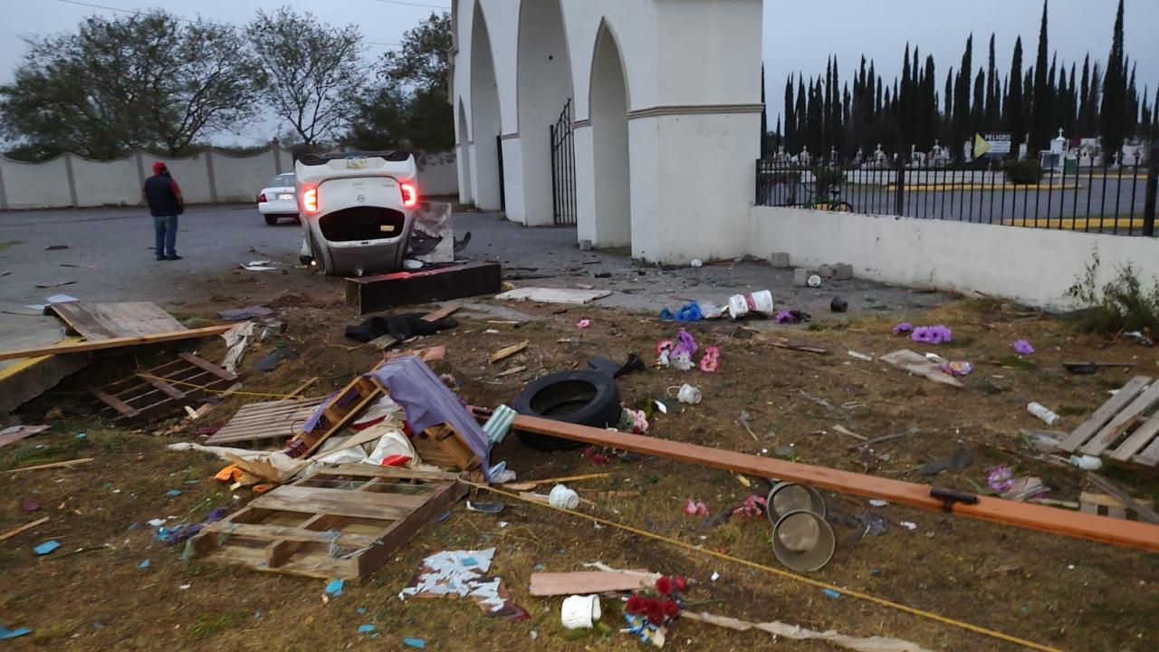 Después de destrozar un negocio de venta de flores, un automóvil compacto terminó volcado con las cuatro llantas hacia arriba en el acceso a un panteón particular.