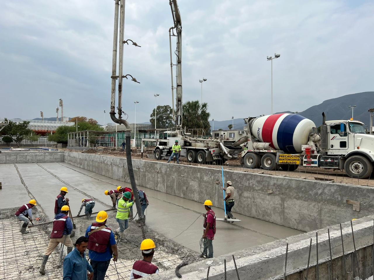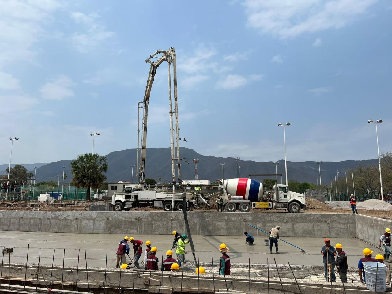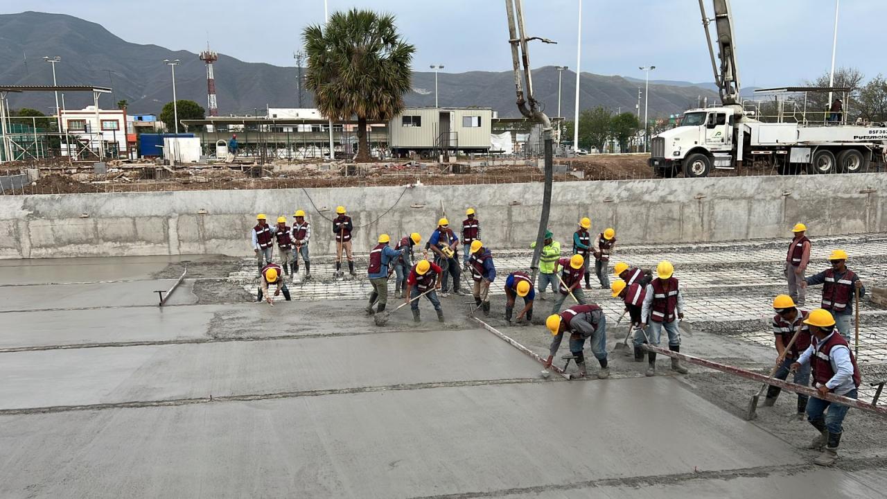 En días recientes, se trabajó en el colado del firme de concreto reforzado con acero e impermeabilizante integral, además de trabajos de infraestructura hidráulica, en el cuarto de máquinas suministrando dos equipos de filtrado, bombeo, toma y retorno de agua, baños y vestidores.