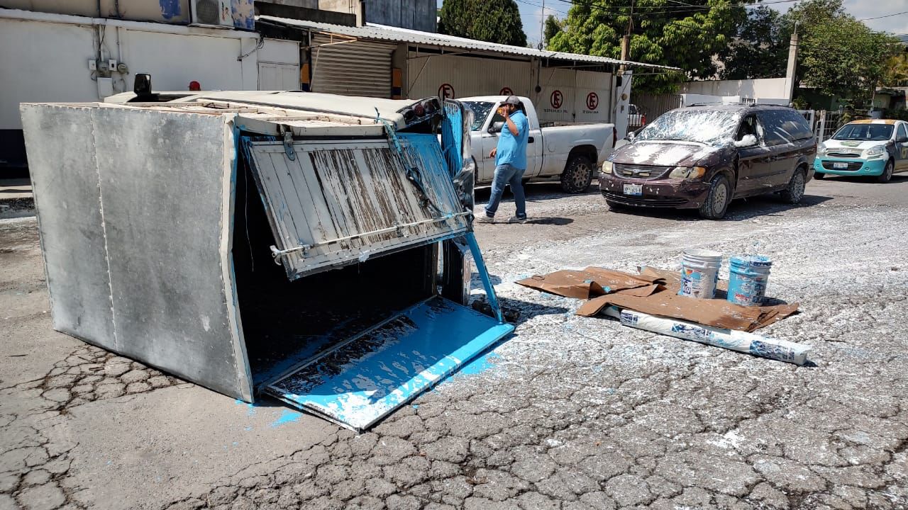 En el impacto el material para impermeabilizar salió disparado de la caja de la camioneta y cayó sobre una unidad tipo pickup marca Chevrolet color blanco que estaba estacionada así como una camioneta WindStar que se encontraba haciendo alto y un tercer vehículo más.