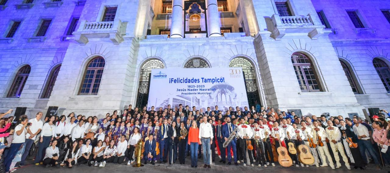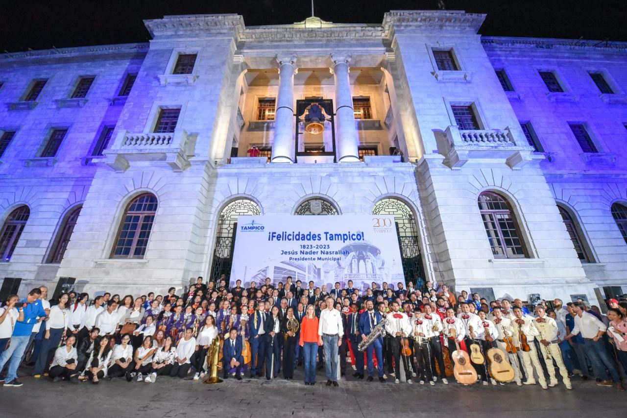 Inolvidable velada vivieron los tampiqueños la noche de este martes con la espectacular participación de más de 160 músicos y mariachis que apostados en el pórtico del Palacio Municipal, entonaron simultáneamente las tradicionales las mañanitas en honor a la ciudad con motivo de sus 200 años de fundación.