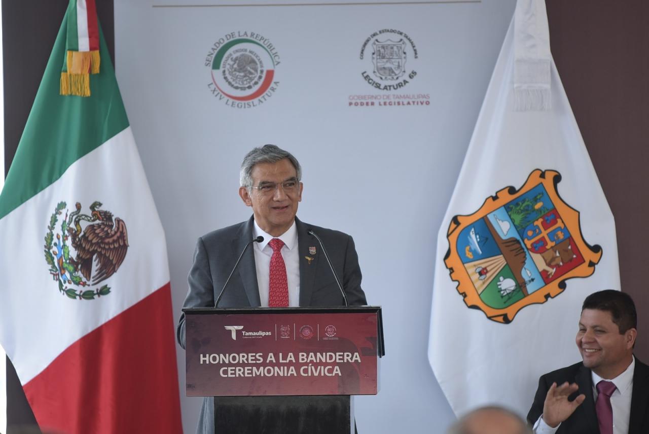 "Llamo desde aquí a las y los jóvenes tamaulipecos a que apuesten por una vida sana y plena teniendo en cuenta que lo inteligente, lo valiente, es permanecer lejos del absurdo espejismo de las adicciones y cuidando de enfrentar con claridad mental las presiones y riesgos que están a su alrededor", expresó el mandatario estatal durante los honores a la bandera a la que asistió el senador Ricardo Monreal, presidente de la JUCOPO en el Senado de la República.