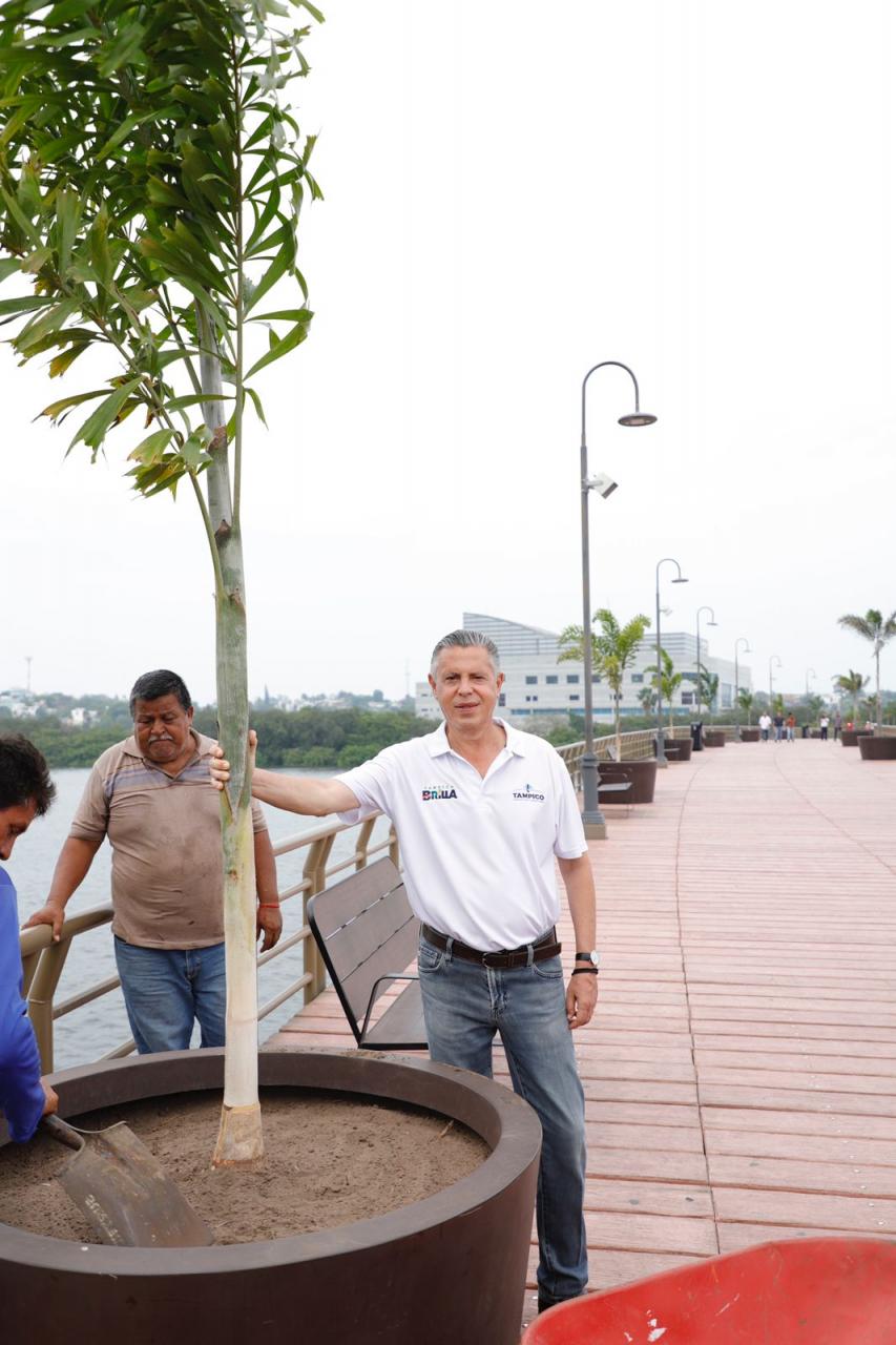Empleados de Servicios Públicos del Ayuntamiento porteño llevaron a cabo la reposición de palmeras en los macetones instalados sobre el puente peatonal de la Laguna del Carpintero luego de fueran vandalizados durante la madrugada del pasado domingo.