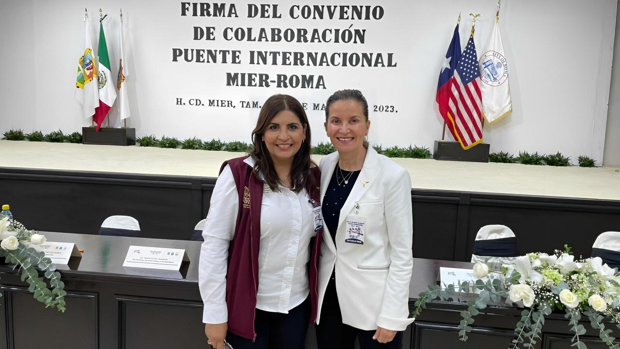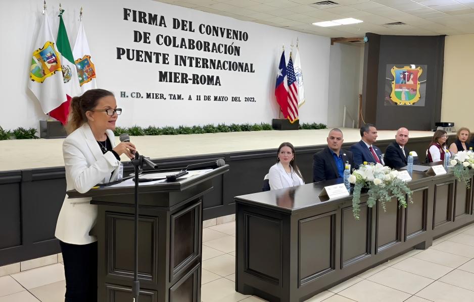 Mier, Tamaulipas.- La secretaria de Economía del Estado, Ninfa Cantú Deándar asistió a la firma del convenio de colaboración para el Puente Internacional Mier - Roma, donde refrendó el compromiso de la administración del gobernador Américo Villarreal para apoyar el desarrollo de infraestructura de comercio exterior en los municipios.