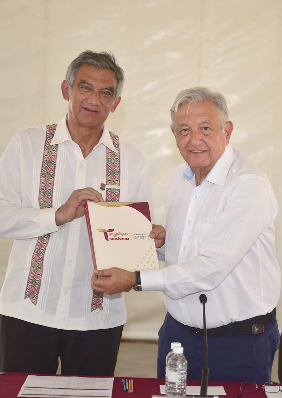 Durante la visita del presidente, el gobernador presentó los avances del Puerto de Matamoros y del Plan de Apoyo que la Federación impulsa para Tamaulipas.