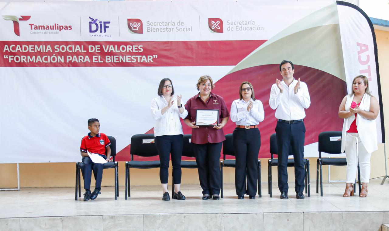 Ciudad Victoria, Tamaulipas. Para reafirmar los valores y la disciplina a través del estudio, el deporte y las actividades extraescolares donde participan alumnos, maestros y padres de familia, el Sistema DIF Tamaulipas que preside la doctora María Santiago de Villarreal, sigue impulsando la Academia Social de Valores denominada “Formación para el Bienestar”