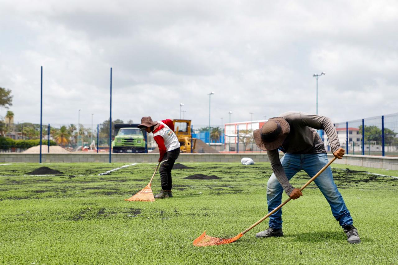 Así lo informó el presidente municipal Chucho Nader al efectuar este día la supervisión de los trabajos que, incluyen la instalación de pasto sintético, construcción de gradas y andadores, espacios sanitarios y vestidores, además de malla periférica y alumbrado especial.