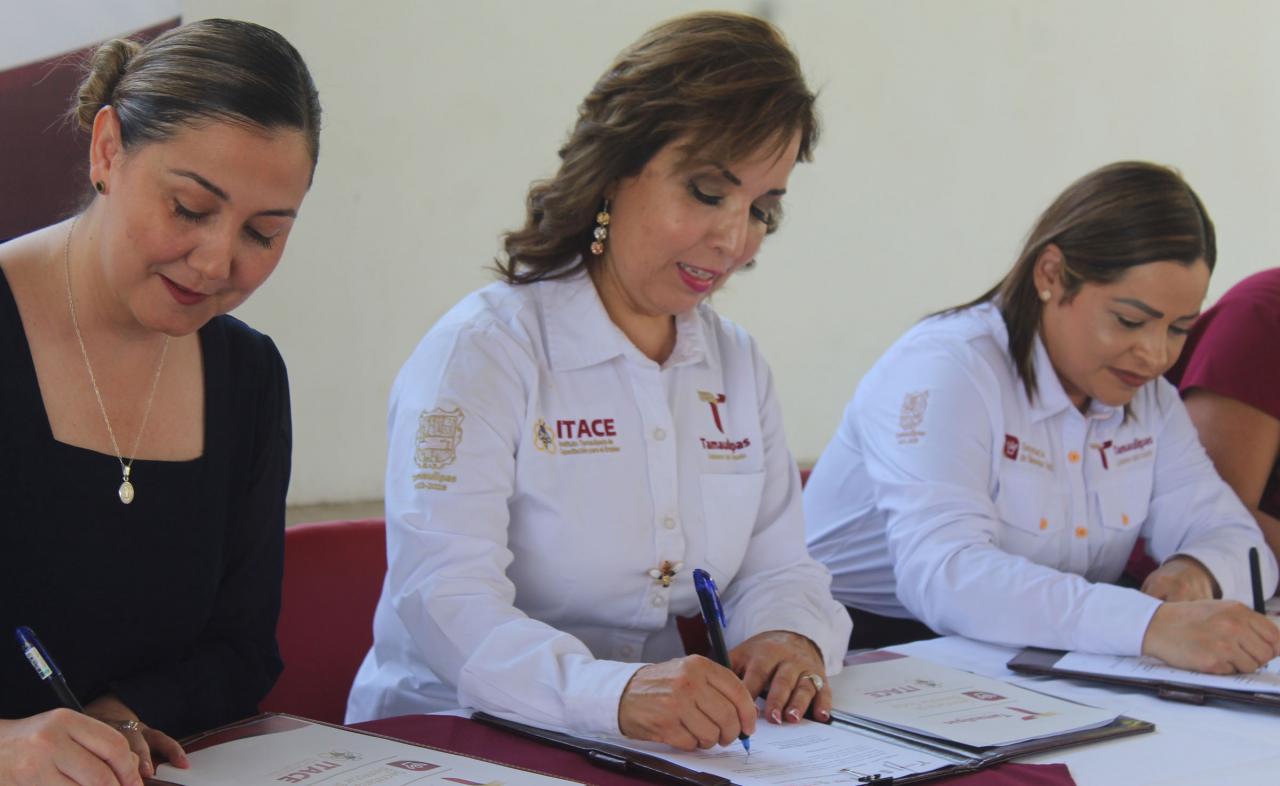 El convenio fue firmado por la directora general del ITACE, Claudia Anaya Alvarado, y la secretaria de Bienestar Social, Verónica Adriana Aguirre de Los Santos, siendo testigos de honor la titular de la Oficina de Enlace de la Secretaría de Educación en Tamaulipas, Sarahí Valdez Ramírez, y la secretaria técnica de la Secretaría de Bienestar Social, Norma Paola Mata Esparza.