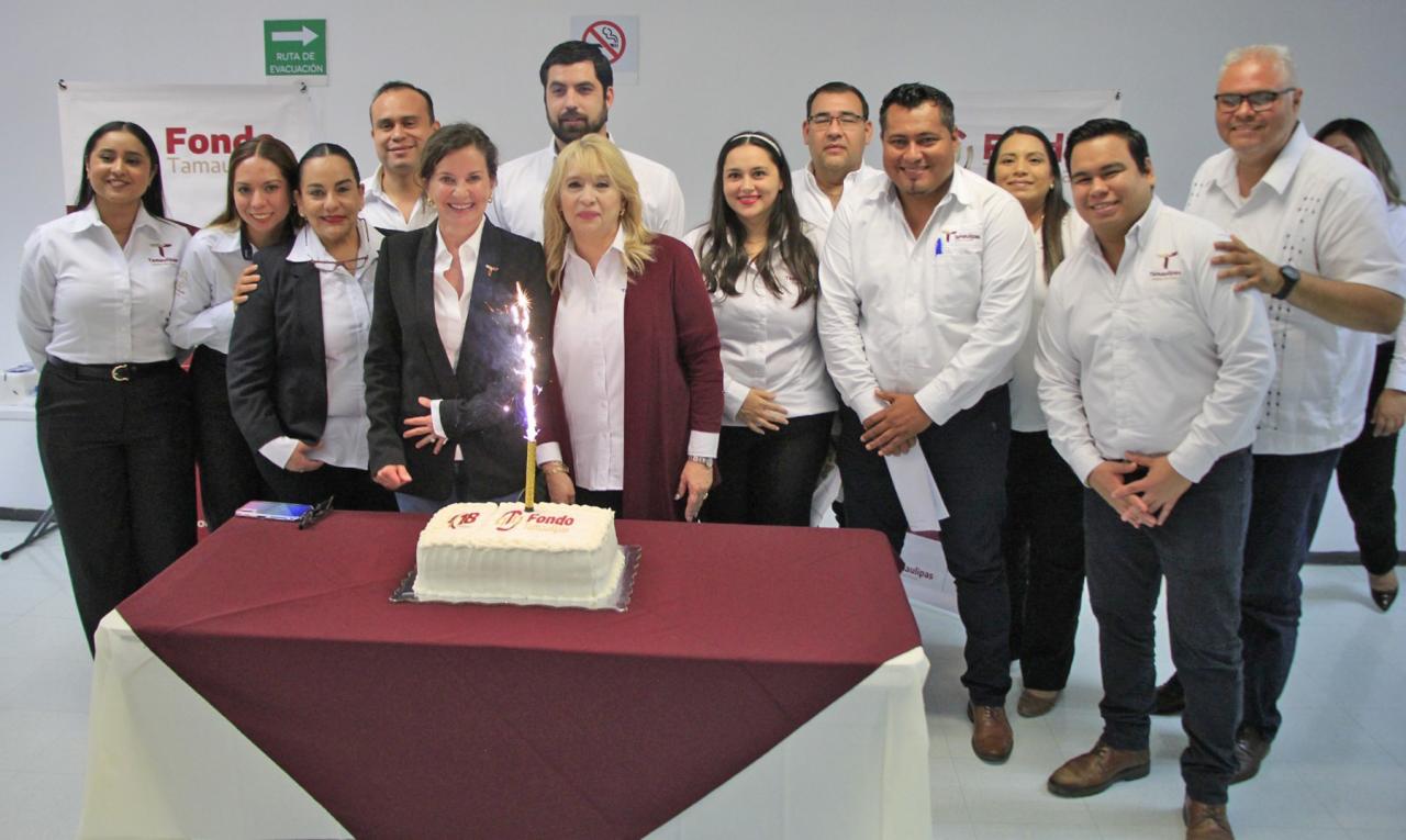 Ciudad Victoria, Tamaulipas.- La secretaria de Desarrollo Económico, Ninfa Cantú Deándar, encabezó este día, la celebración del aniversario 18 del Fondo Tamaulipas junto con la directora general, Sandra Mejía Bárcena y la comunidad de colaboradores de esta institución del gobierno estatal.