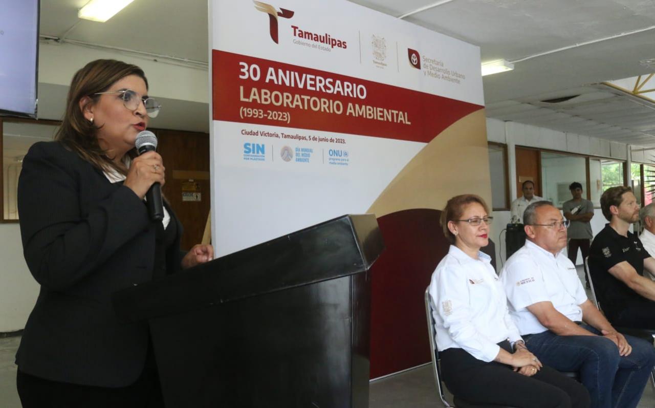 Ciudad Victoria, Tamaulipas. - En el marco de la conmemoración del “Día Mundial del Medio Ambiente”, la titular de la Secretaría de Desarrollo Urbano y Medio Ambiente, Karina Lizeth Saldívar Lartigue, asistió al Laboratorio Ambiental del Estado de Tamaulipas, para a su vez, celebrar el 30 aniversario, desde que a iniciativa del entonces gobernador Américo Villarreal Guerra, padre del actual mandatario estatal Américo Villarreal Anaya, correspondió fundar este centro de análisis e investigación.