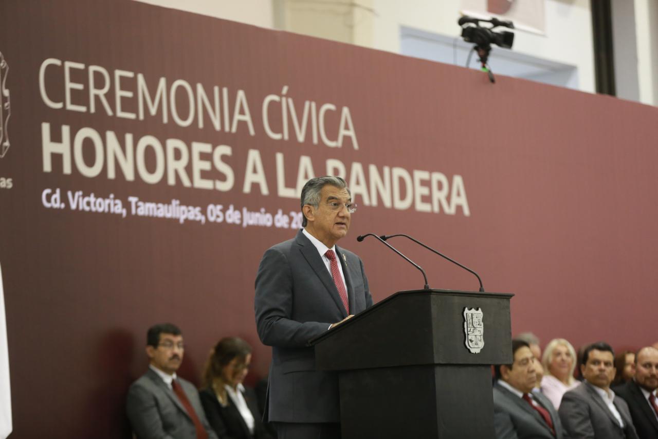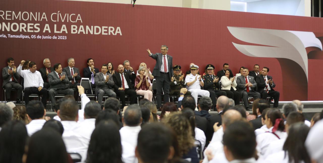 Junto a su esposa, la doctora María de Villarreal, presidenta del Sistema DIF Tamaulipas, durante la ceremonia cívica de honores, en el Polyforum de esta capital, el gobernador recordó que el cinco de junio del año pasado, el pueblo de Tamaulipas resistió las peores argucias de la mapachería electoral y superó toda clase de prácticas mafiosas, por parte de aquellos que se creían dueños de Tamaulipas y traicionaron al pueblo.