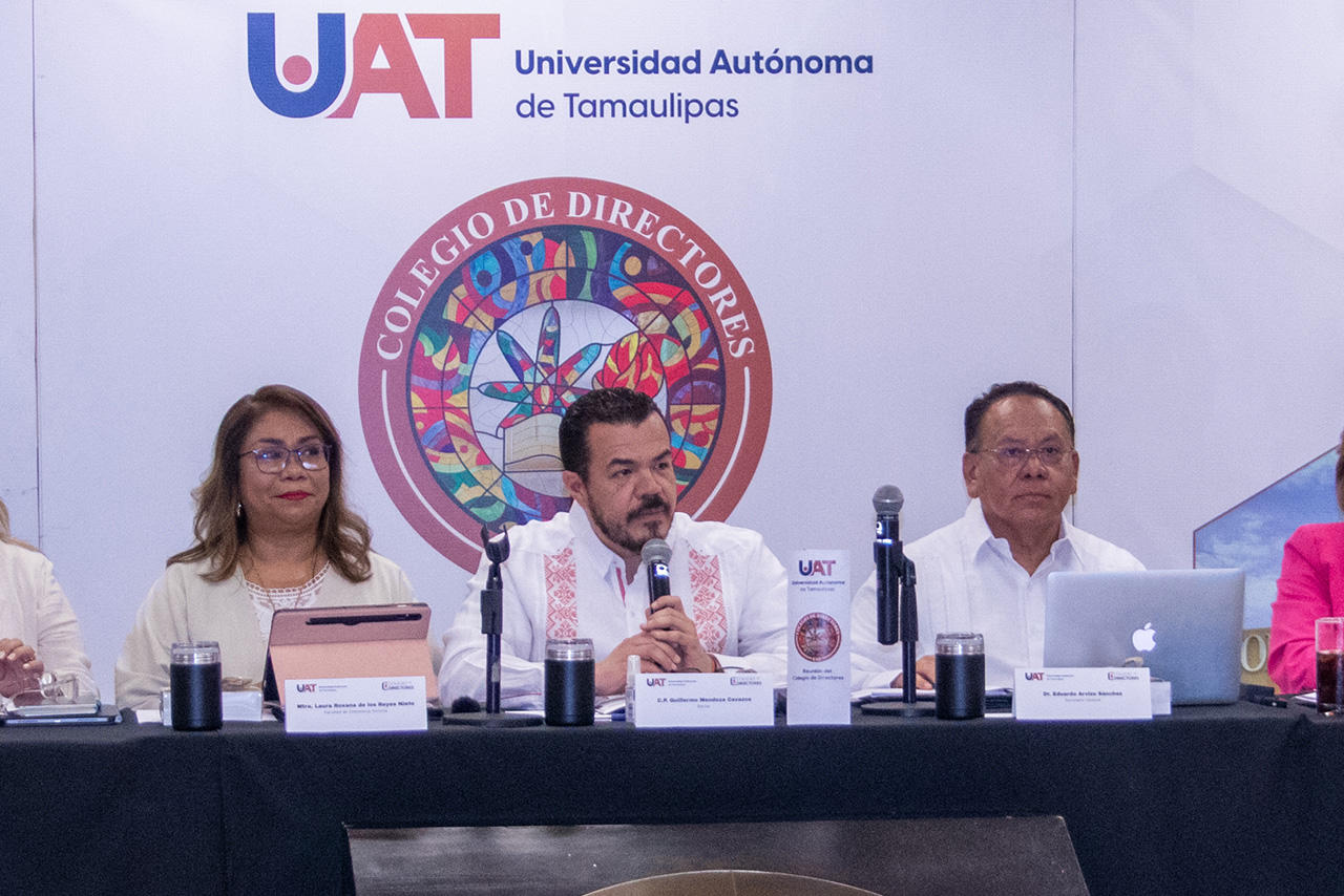 El C. P. Guillermo Mendoza Cavazos, rector de la Universidad Autónoma de Tamaulipas (UAT), presidió la decimocuarta reunión del Colegio de Directores, que tuvo como sede la Facultad de Enfermería Victoria (FEV); sesión en la que se presentaron los avances que fortalecerán los servicios educativos de la máxima casa de estudios en la entidad.