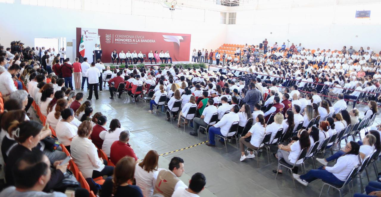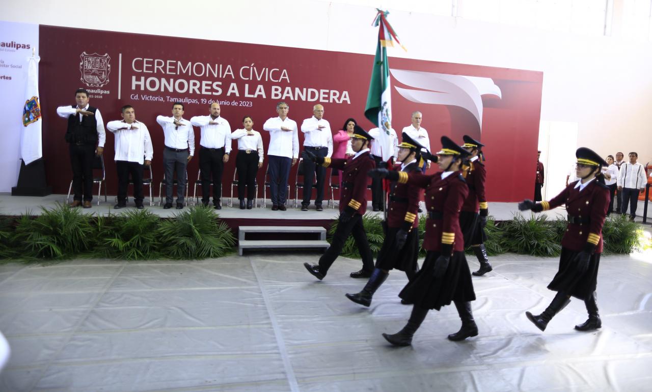 “Debemos y podemos llenar las actividades de cada cancha, de cada complejo, de cada Unidad Deportiva, por eso es un gusto venir a este recinto para celebrar la ceremonia cívica de honores a la bandera y ratificar frente a todas y todos ustedes el compromiso de impulsar una política de deporte en Tamaulipas destinada a romper récords históricos”, afirmó.