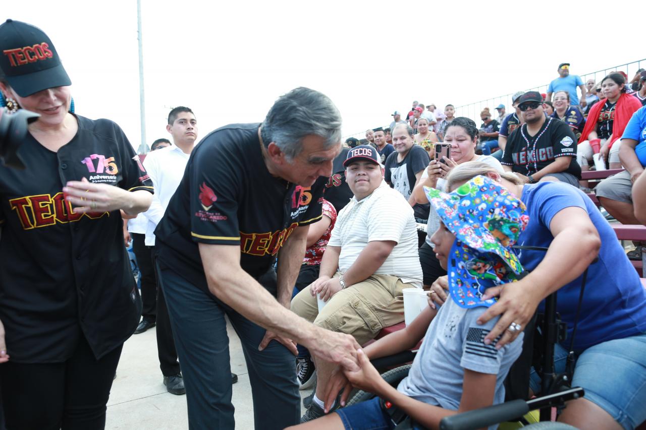 Luego del lanzamiento inaugural, el gobernador, enfundado en el jersey de los Tecolotes, subió a las gradas del estadio en donde convivió con los aficionados, quienes lo recibieron entusiastamente.