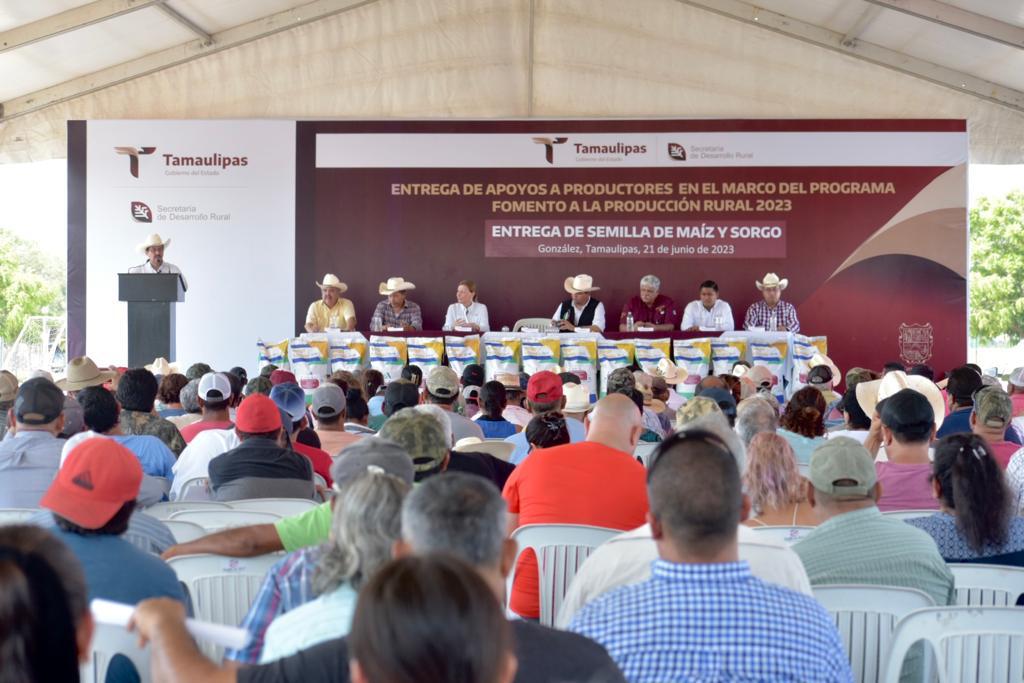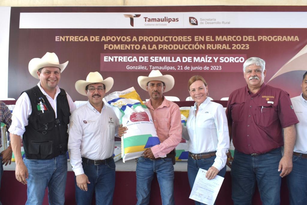 El secretario de Desarrollo Rural, Dámaso Anaya Alvarado destacó que de igual manera se hizo entrega de un total de 17.46 toneladas de semilla de sorgo ADV G3247, que corresponde a 873 sacos de 20 kg. Esta semilla de sorgo y maíz es para los municipios de Aldama, Altamira, González, Gómez Farías y El Mante.