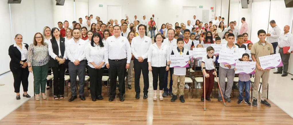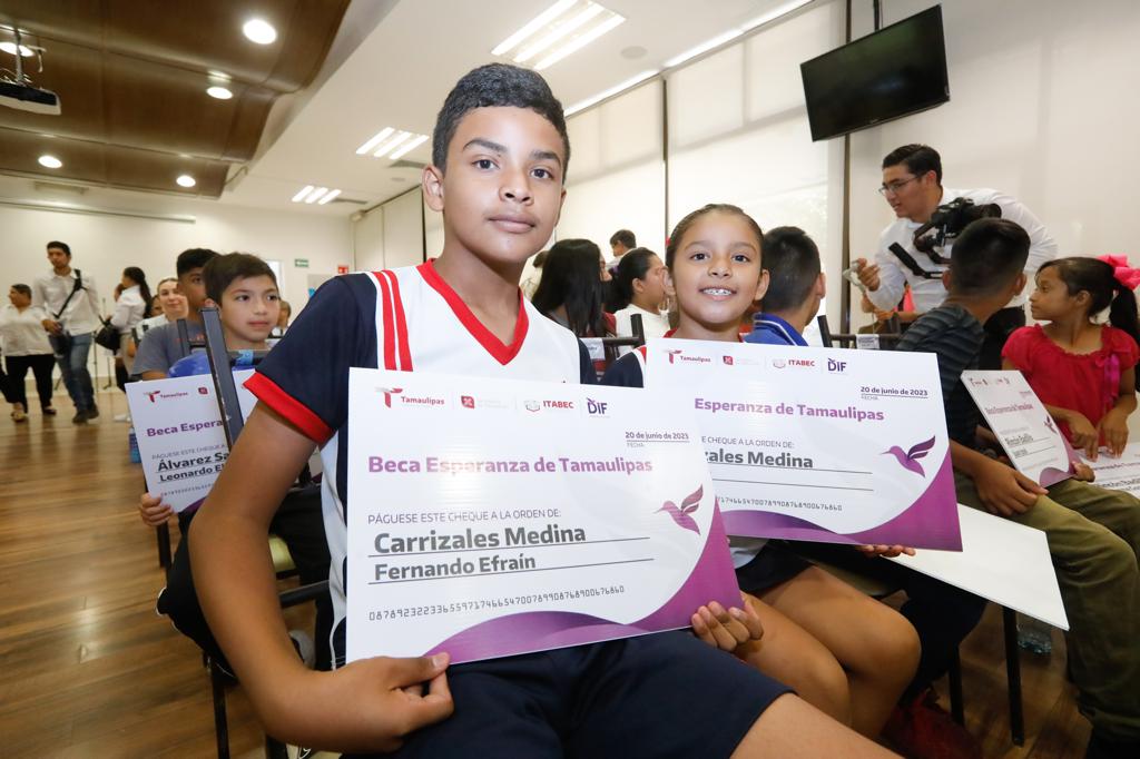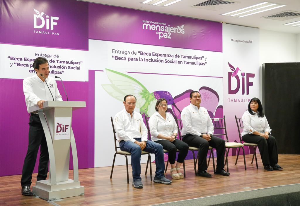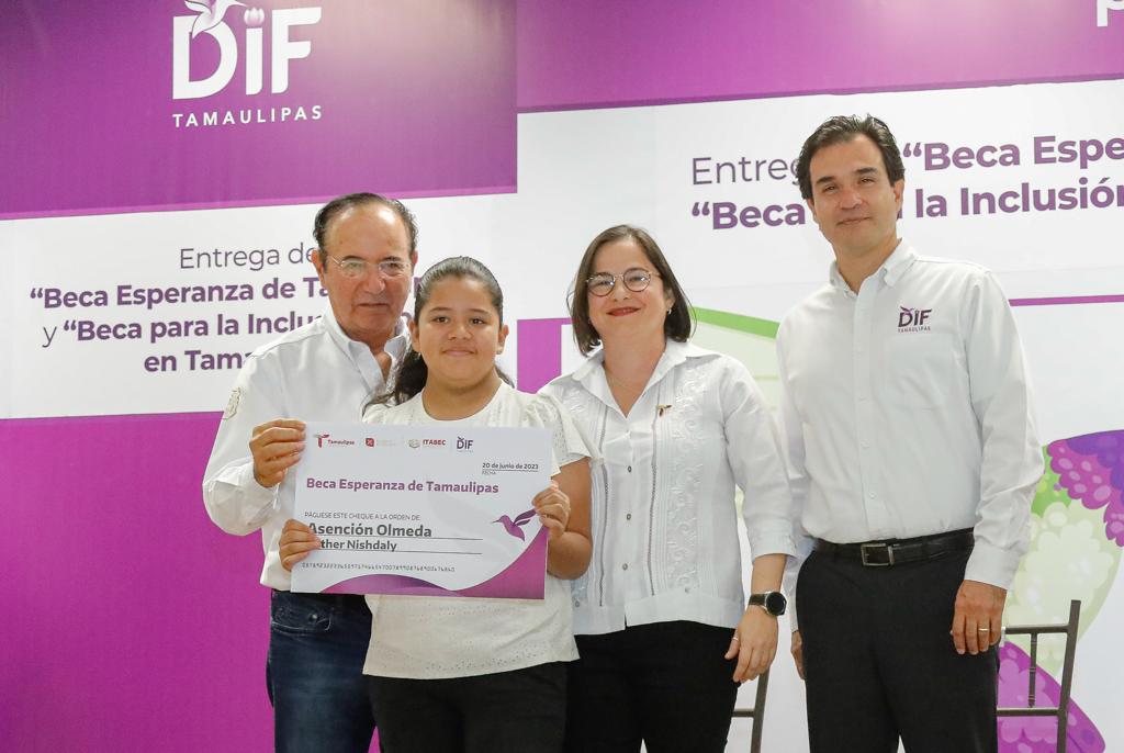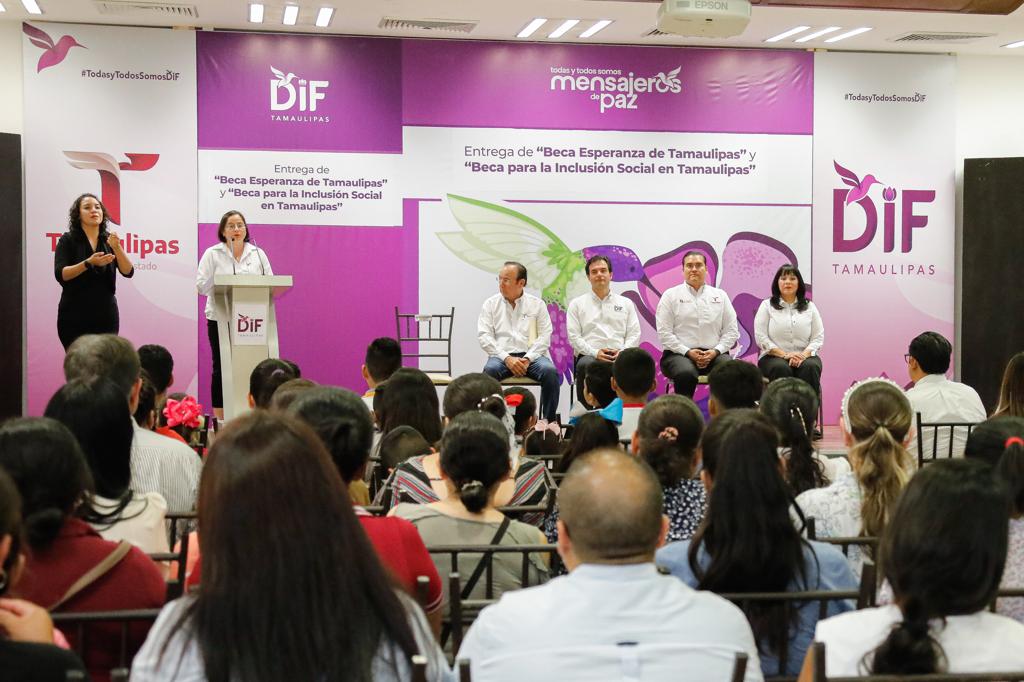 Ciudad Victoria, Tamaulipas. Para garantizar el acceso y permanencia en el sistema educativo estatal a las niñas, niños y jóvenes tamaulipecos en situación de vulnerabilidad y contribuir a disminuir la deserción escolar, el Sistema DIF Tamaulipas que preside la doctora María Santiago de Villarreal junto a la Secretaría de Educación de Tamaulipas, realizaron una entrega simbólica de 20 becas “Esperanza de Tamaulipas” y “Por la Inclusión Social en Tamaulipas”, de un total de mil 810 que serán distribuidas entre beneficiarios de los 43 municipios de la entidad.