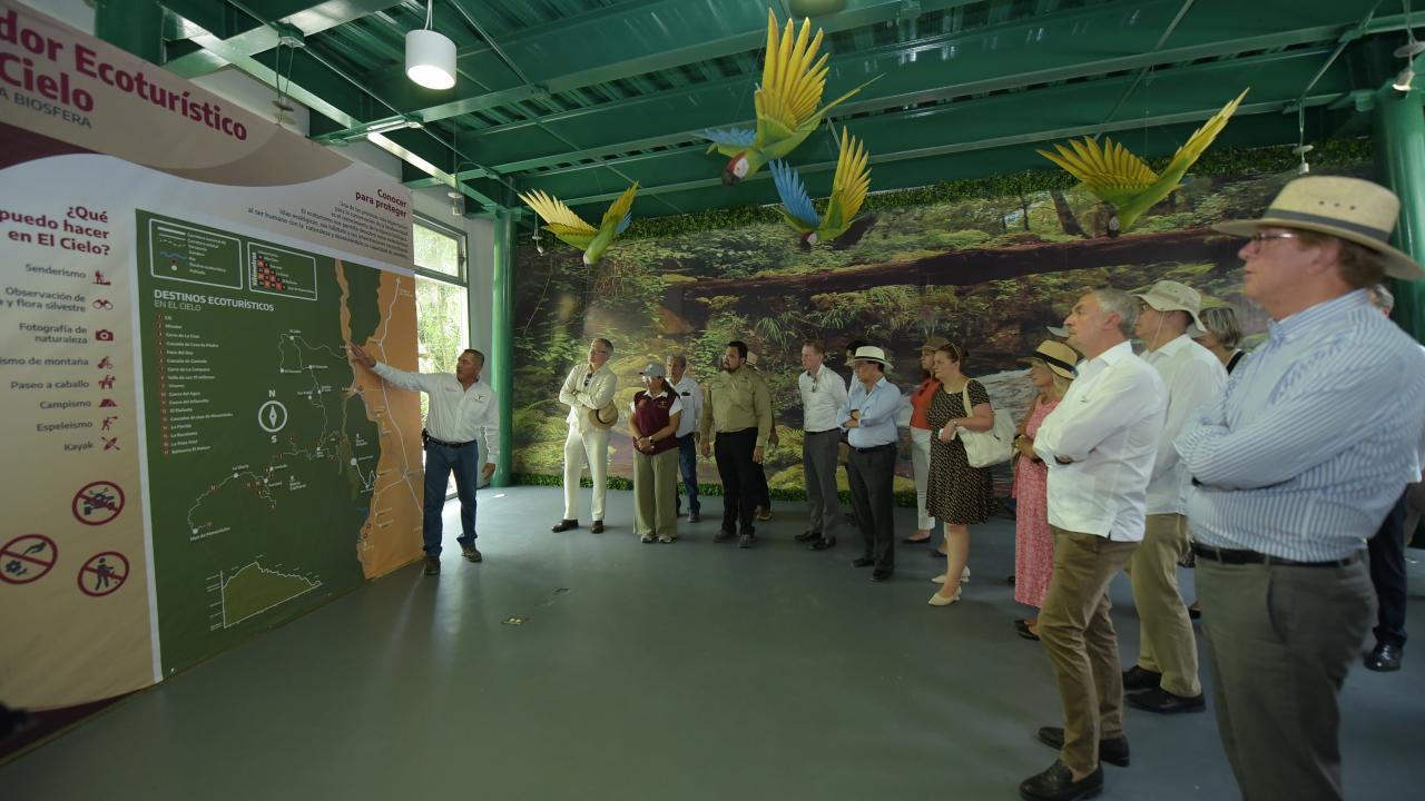 Por la mañana, en el municipio de Gómez Farías las y los embajadores se reunieron con la secretaria de Desarrollo y Medio Ambiente, Karina Lizeth Saldívar Lartigue y con la subsecretaria de Turismo, Verónica Loredo quienes expusieron las acciones, programas y proyectos de cada dependencia que se desarrollan en la reserva de la Biósfera de "El Cielo", un espacio de riqueza excepcional y declarada por Naciones Unidas como Reserva de la Humanidad.