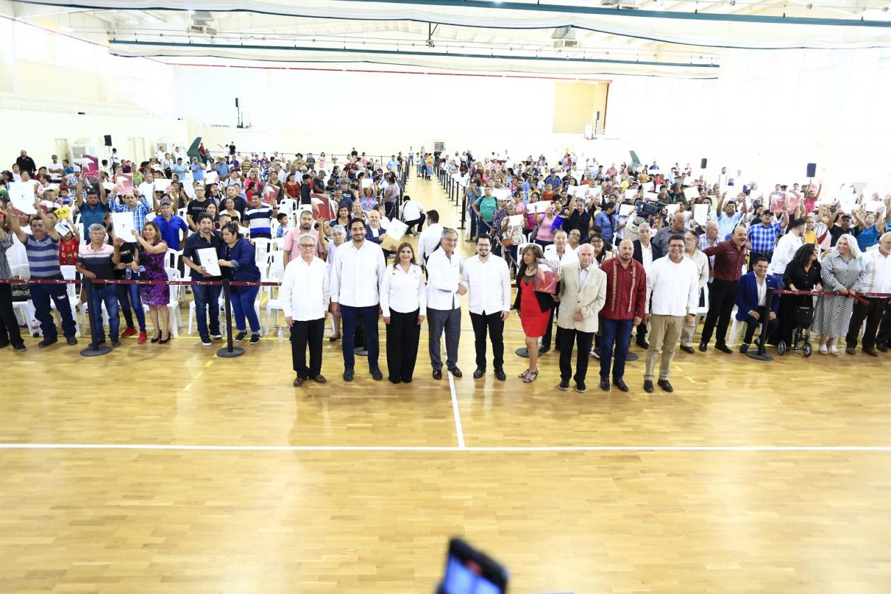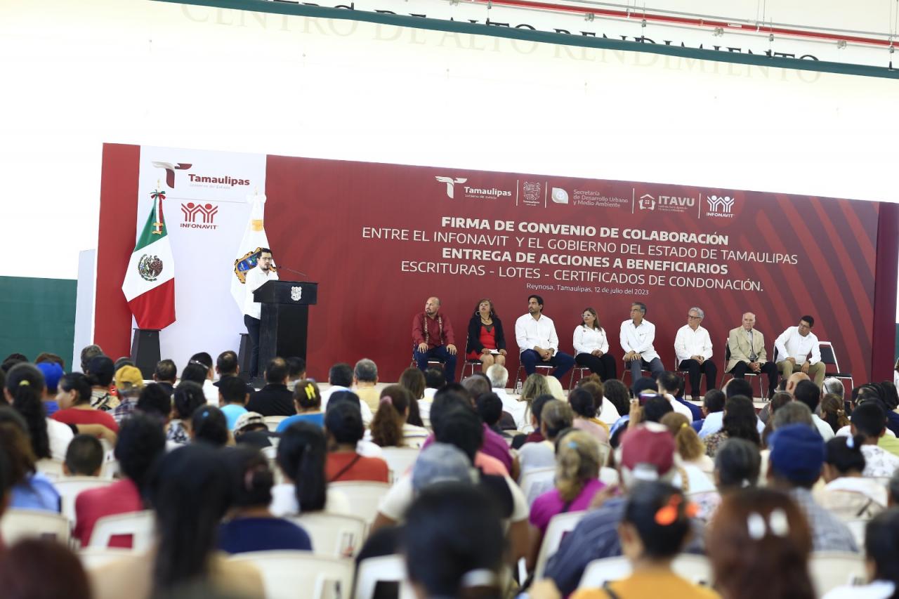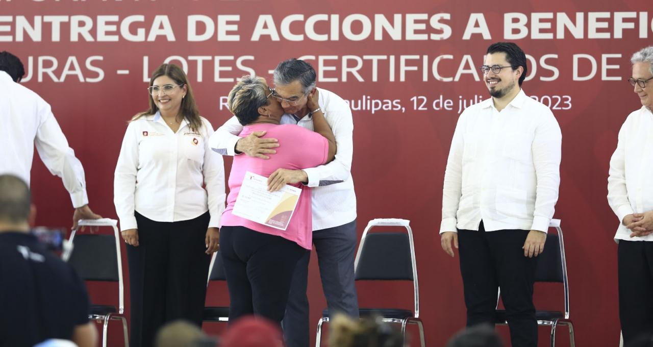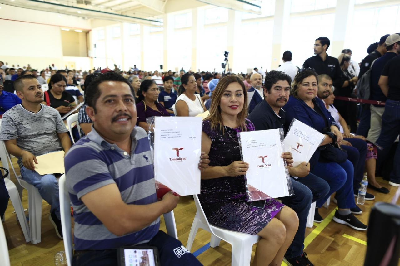 Durante el evento de entrega de acciones a beneficiarios, escrituras, lotes y certificados de condonación, celebrado en la Unidad Deportiva de Reynosa, el gobernador Américo Villarreal Anaya aseguró que es un día de fiesta, ya que muchas familias esperaron durante años este momento para poder tener certidumbre en la propiedad de su hogar y con sus escrituras en propia mano.