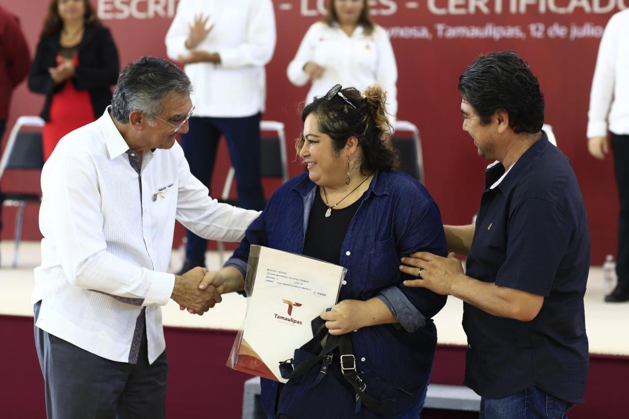 A nombre de los beneficiarios de colonias como la Universitaria, Solidaridad, El Olmito y del Fraccionamiento Nuevo México, la señora San Juana Reyna Sandoval agradeció al gobernador Américo Villarreal por hacer realidad un sueño que, para algunas familias, llevó hasta 15 años esperando la entrega de sus escrituras.