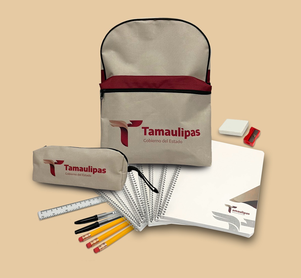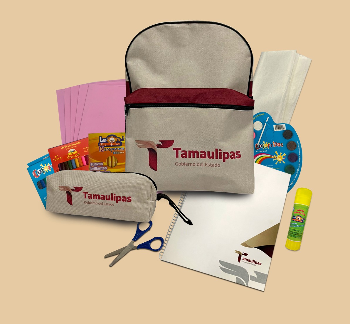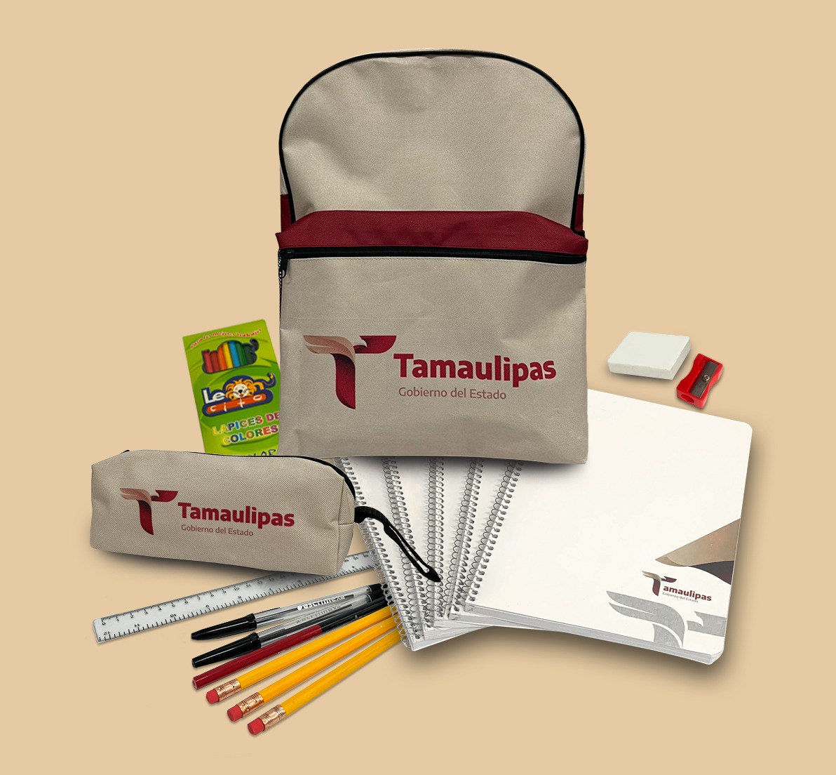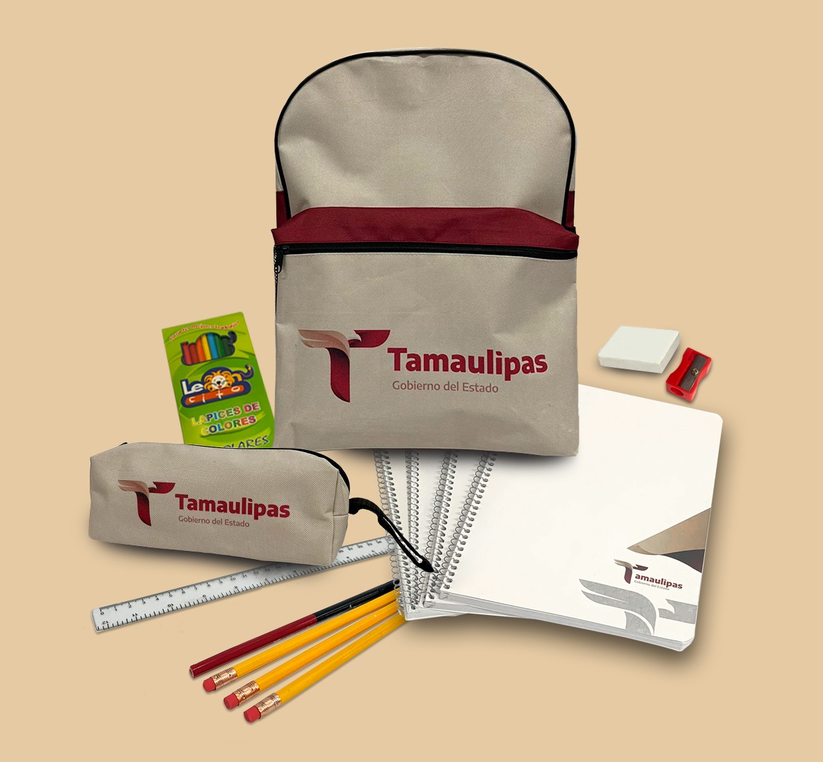 Para las y los alumnos de primero a tercer grado de primaria, el paquete estará compuesto por cuaderno profesional de cuadro grande con 100 hojas, cuaderno profesional de raya con 100 hojas, cuaderno profesional doble raya con 100 hojas, cuaderno profesional dibujo con 100 hojas, tres lápices número dos, bicolor, caja de colores de madera con 12 lápices, goma para borrar, sacapuntas, regla graduada y mochila con lapicera; de cuarto a sexto grado de Primaria, llevará cuaderno profesional de cuadro grande con 100 hojas, cuaderno profesional cuadro chico con 100 hojas, tres cuadernos profesionales de raya con 100 hojas, tres lápices número dos, bicolor, caja de colores de madera con 12 lápices, dos bolígrafos, goma para borrar, sacapuntas, regla graduada y mochila con lapicera.