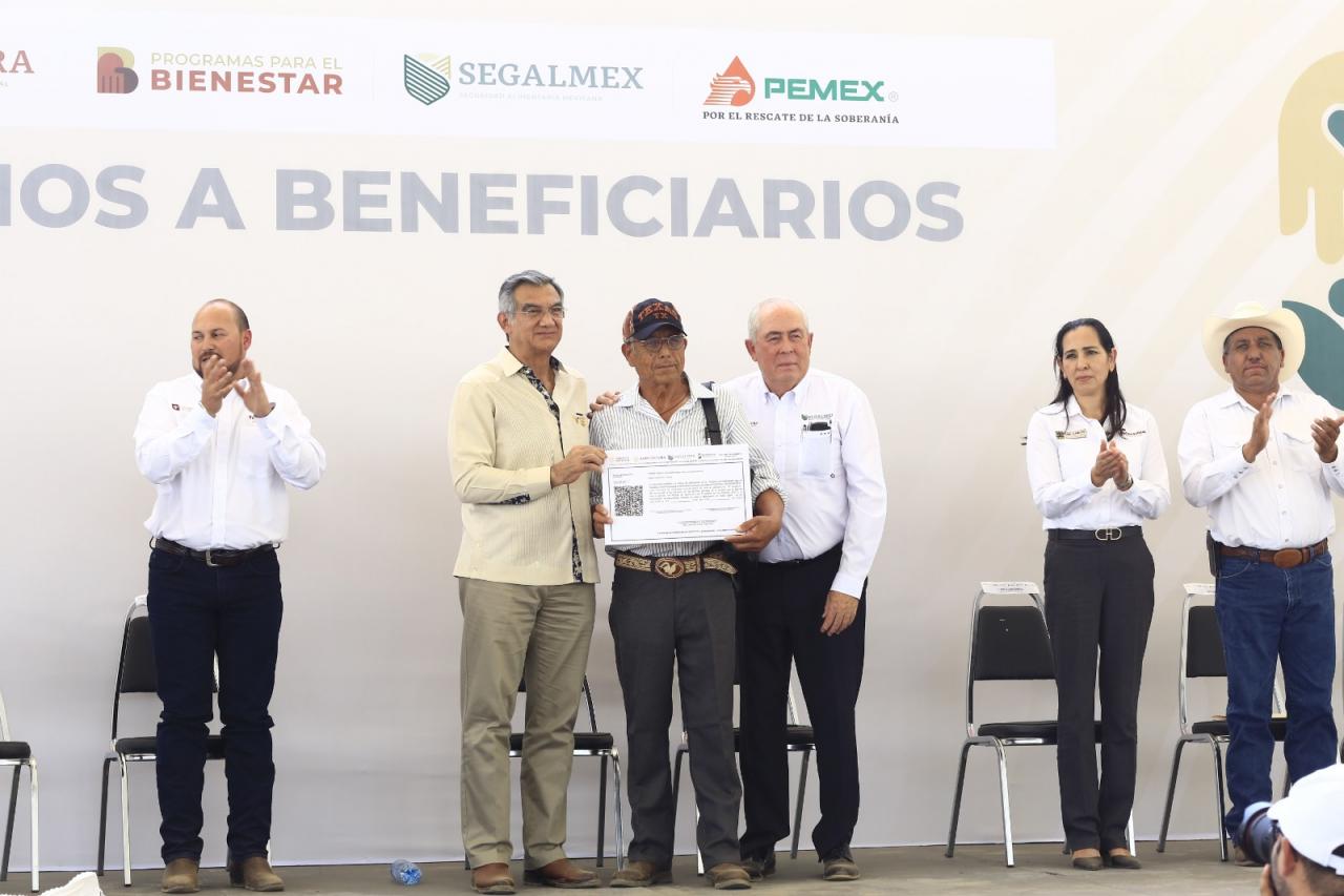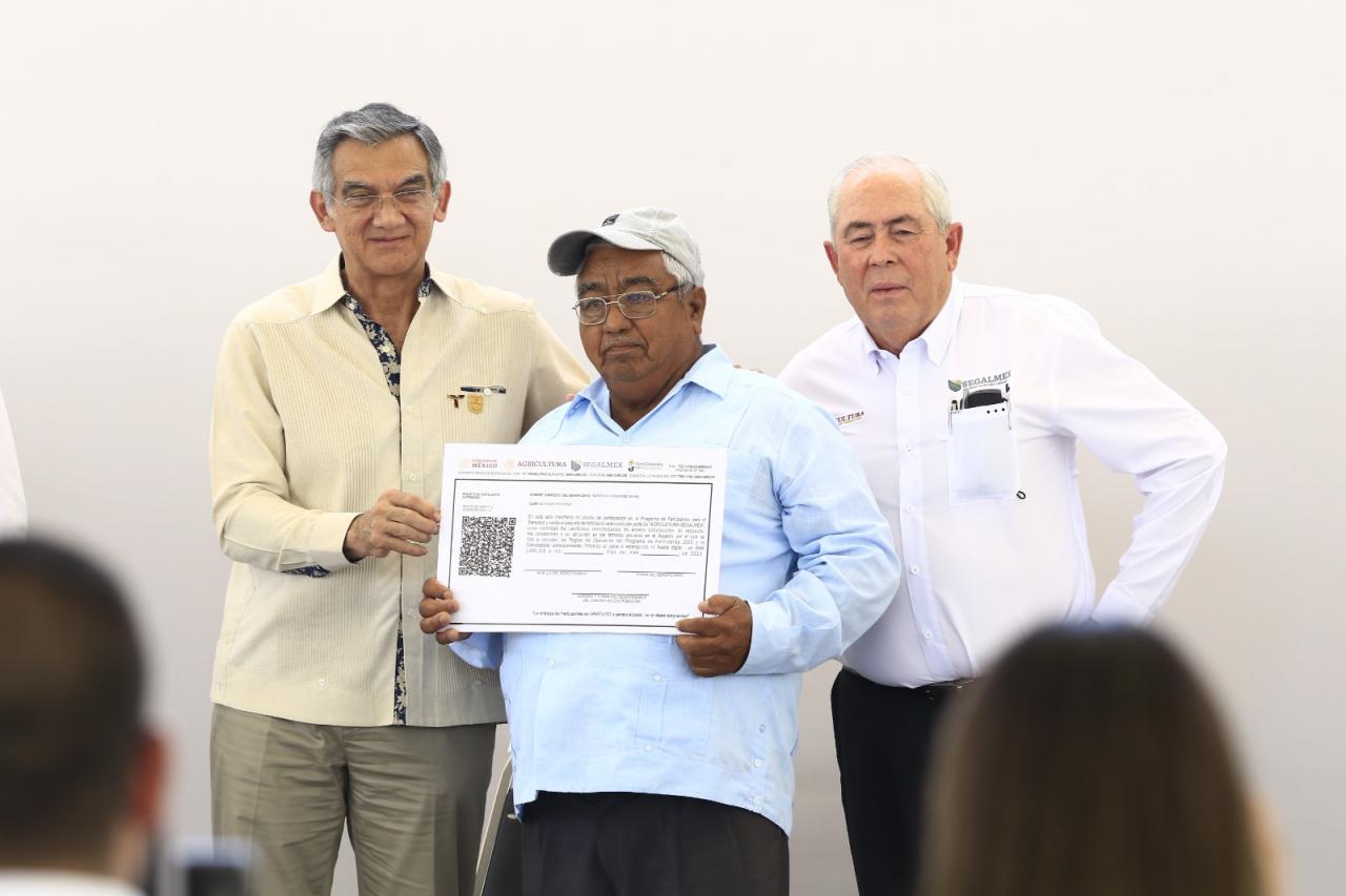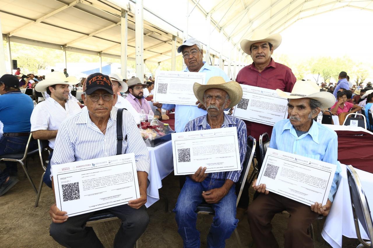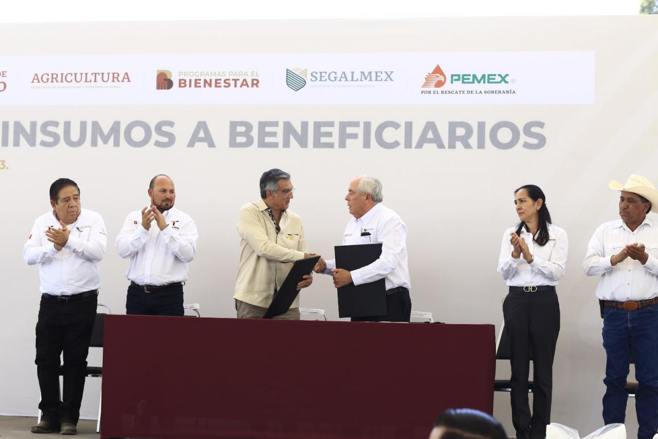 Las autoridades estatales y federales hicieron una entrega simbólica del insumo a los pequeños productores Ramón Pérez Rodríguez, José Guevara Marín, Martín Borrego Hernández, Ismael Borrego Padilla y Vidal Borrego.