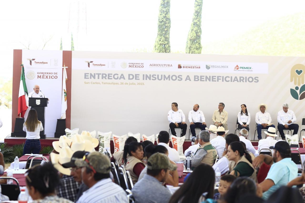 San Carlos, Tamaulipas.- Al ser prioridad que Tamaulipas retome su lugar como uno de los principales productores de alimentos en el país, el gobernador Américo Villarreal Anaya y el director general de Seguridad Agroalimentaria Mexicana (SEGALMEX) Leonel Cota Montaño, iniciaron el programa Fertilizantes para el Bienestar en el municipio de San Carlos, el centro de la llamada "Sierra Chiquita" y tierra del mezcal y la picota.