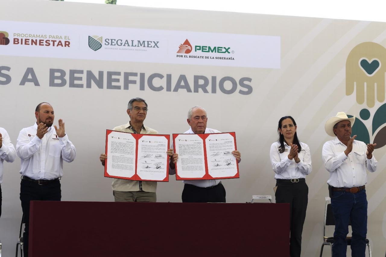 Durante este evento, el gobernador Américo Villarreal y el director general de SEGALMEX Leonel Cota, firmaron un convenio para suministrar el servicio de despensas a los ciudadanos en condiciones de vulnerabilidad, en mejores condiciones de calidad y precio, ya que están un 25% menos en costo que en los comercios.