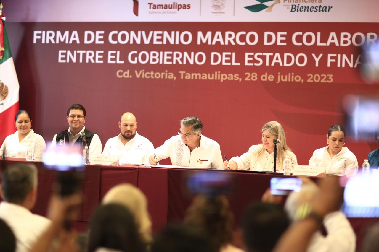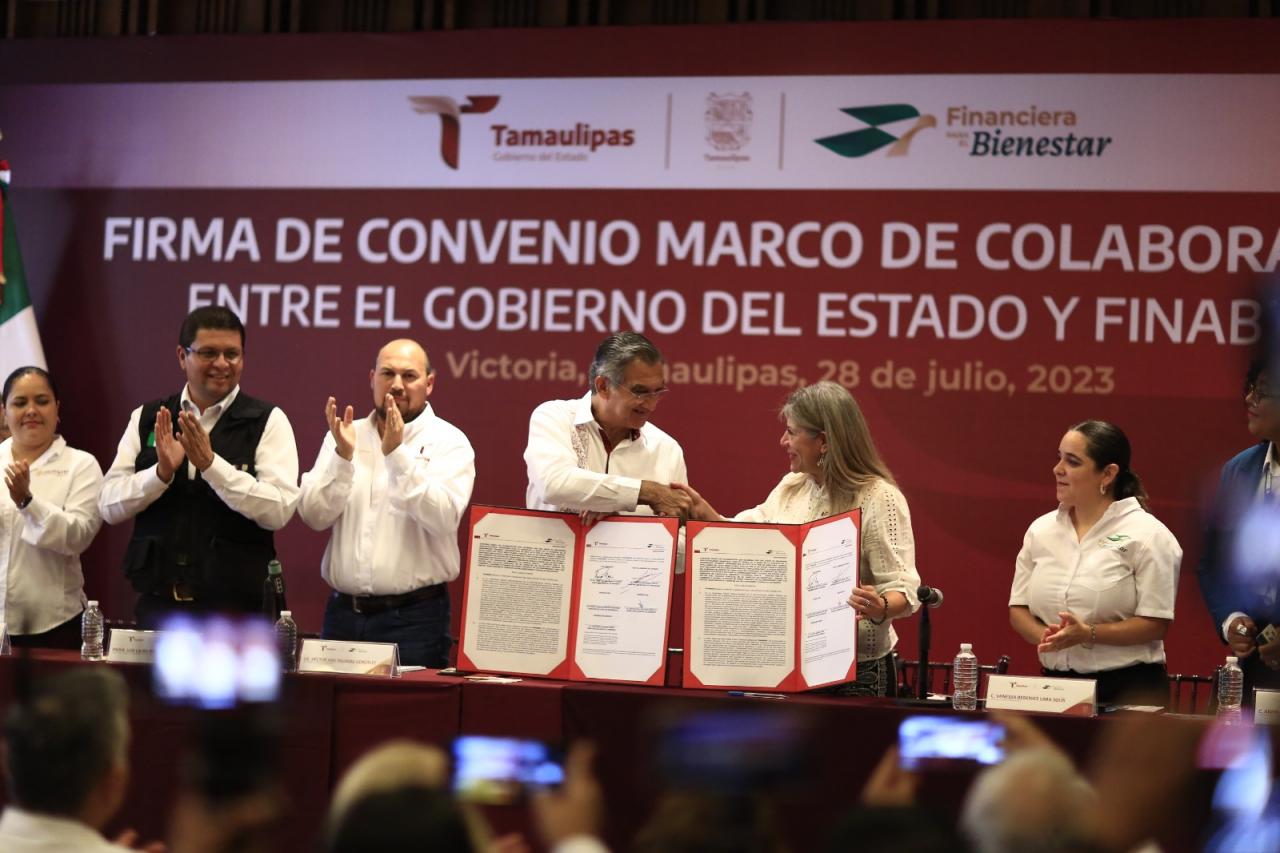 Ciudad Victoria, Tamaulipas.- Para acercar los servicios financieros básicos a las y los tamaulipecos que menos acceso tienen, el gobernador Américo Villarreal Anaya y la directora general de Financiera para el Bienestar, Rocío Mejía Flores firmaron un convenio marco de colaboración, mediante el cual se impulsarán tres esquemas básicos: fomentar el ahorro, acercar apoyos crediticios y el punto primordial, al ser Estado fronterizo, la recepción de remesas.